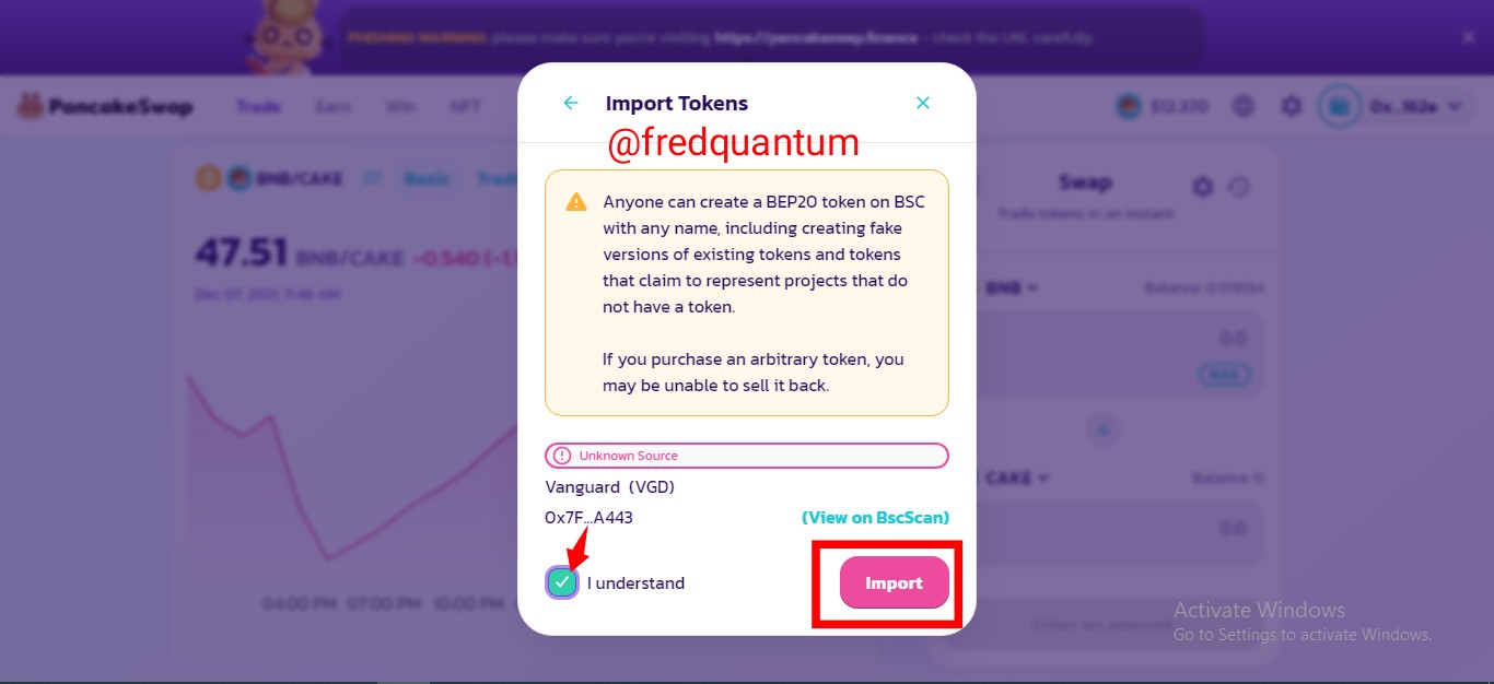 - On the next interface, there is a warning about how anyone can create a BEP20 token, this is to caution one about the probability of buying into a fake project if enough research was not carried out. I ticked the understand box and clicked import. See the screenshot below.