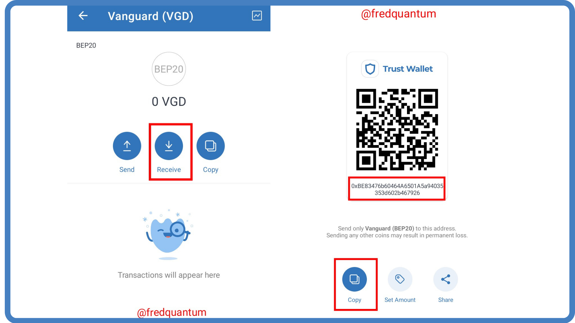 - To copy the public address of the wallet which would be used for deposit, I clicked on Receive on the wallet and the address was revealed, then I tapped the Copy button. The address is 0xBE83476b60464A6501A5a94035353d602b467926. See the screenshots below.