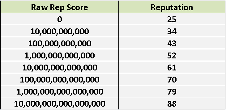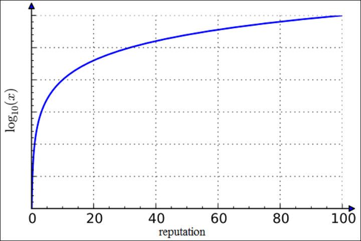 Also, as shown on the curve, reputation follows a base 10 logarithmic mathematical formula, but actually the numbers that represent reputation score are too long, which can be in the trillions. Therefore, he simplifies it further by using a formula: