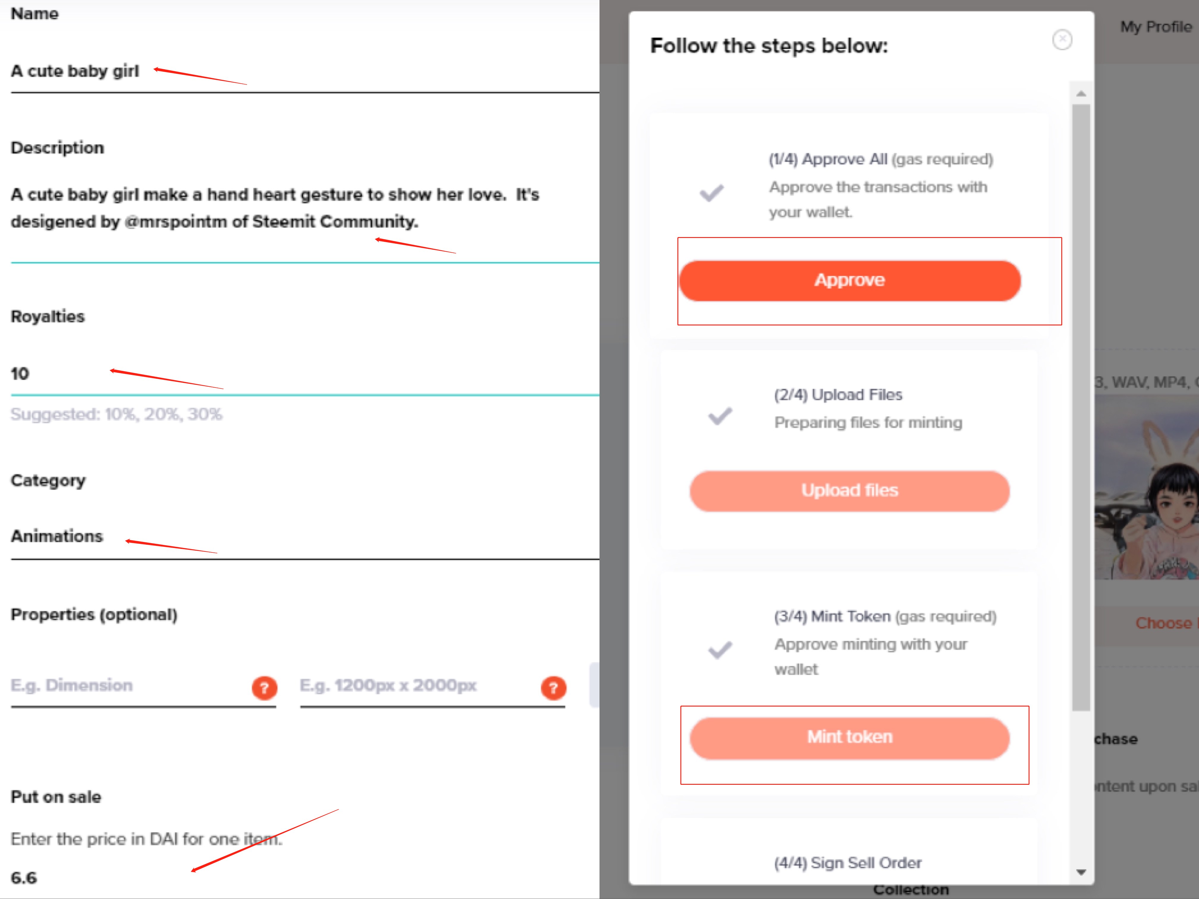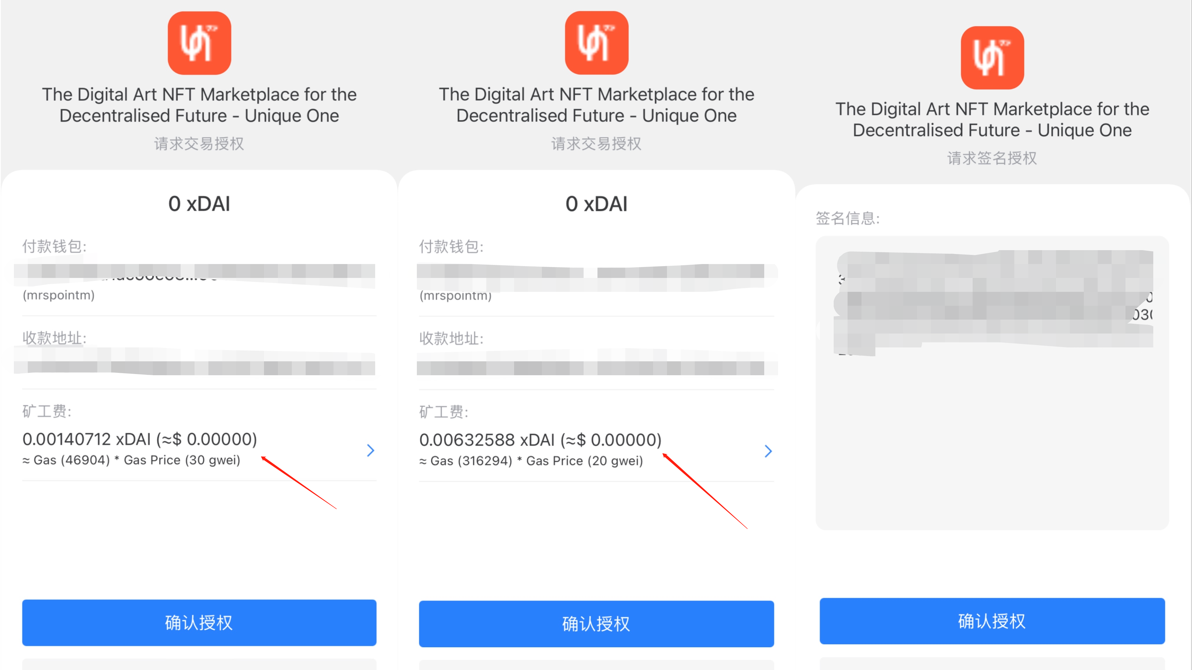 左上图的这些为必填项,根据作品填入相关的信息即可,填完后进行最后一步操作,一共有4个环节,右上图mark出的那两步需要少许xDai作为手续费。