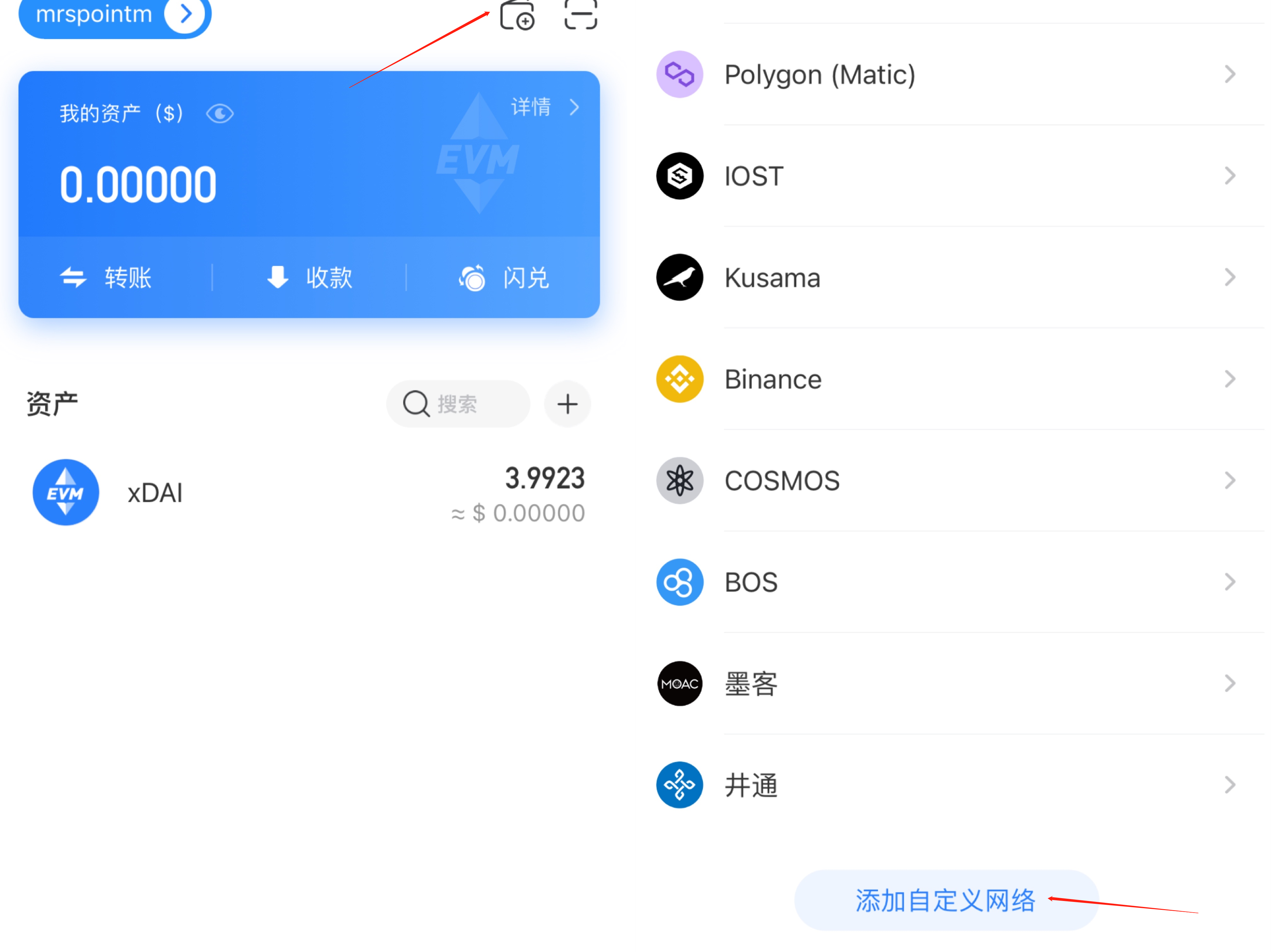 点击钱包加号,进入后拉到页面底部进行自定义网络添加。