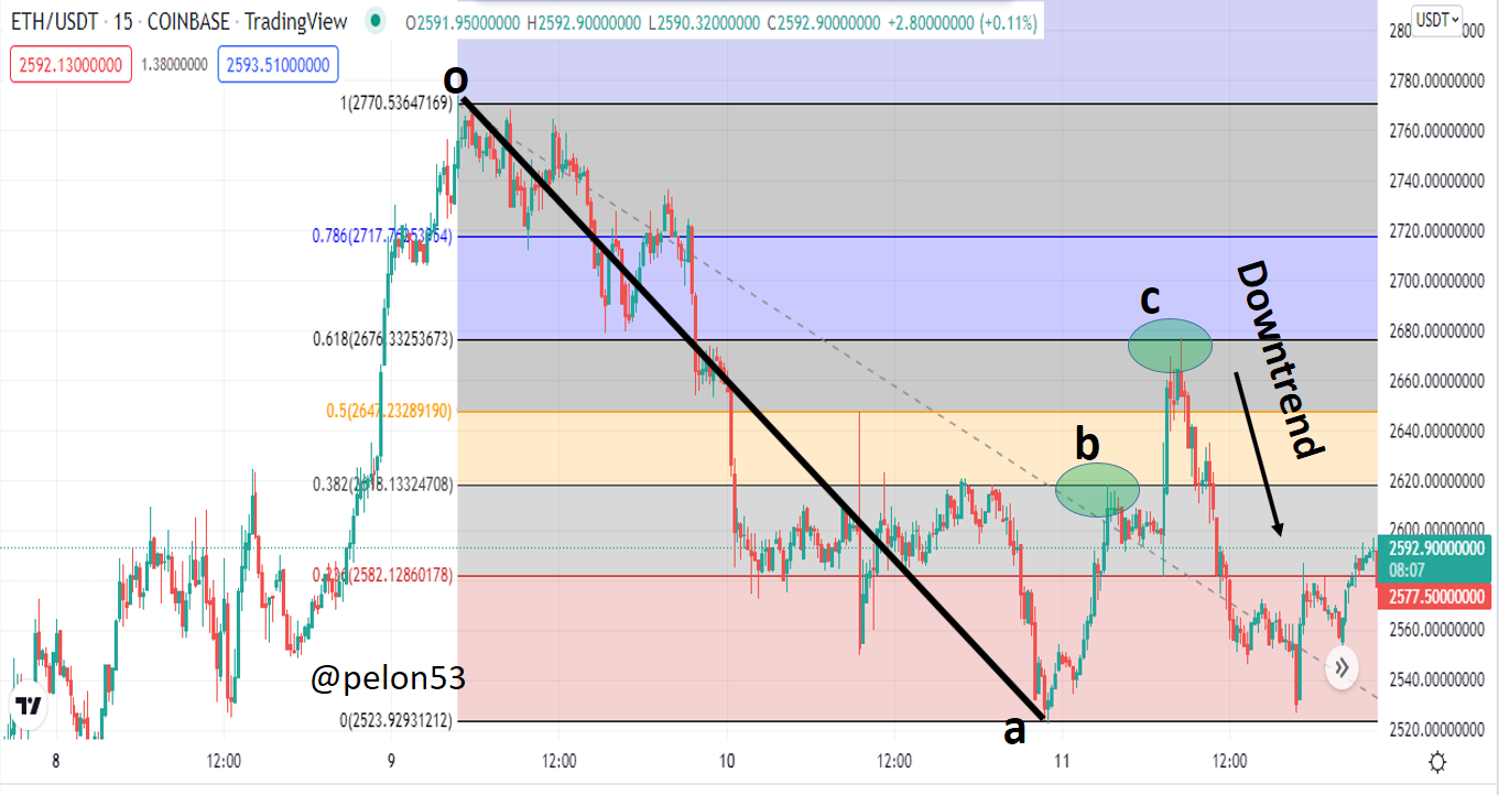 En una tendencia bajista, usaremos el gráfico ETH/USDT, 15 minutos. La tendencia bajista comenzó en el punto (o) y llegó hasta el punto (b), allí marcamos los retrocesos de Fibonacci.