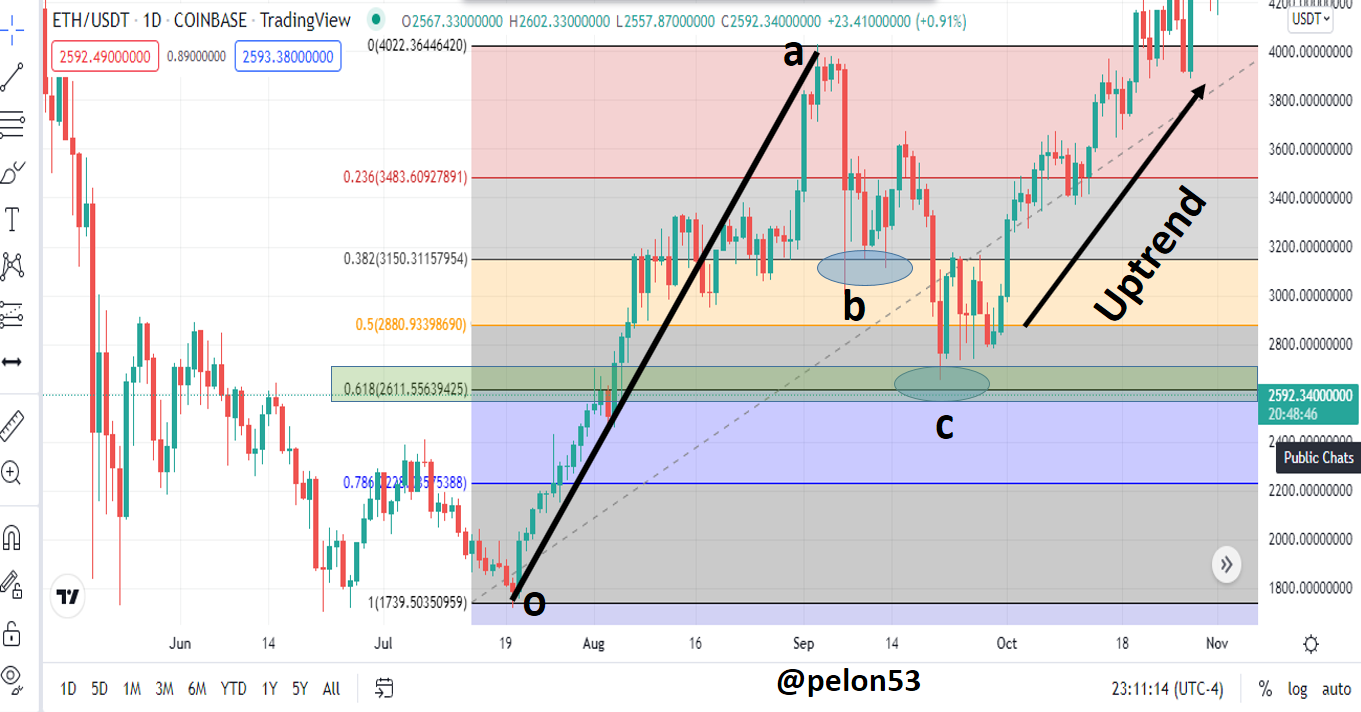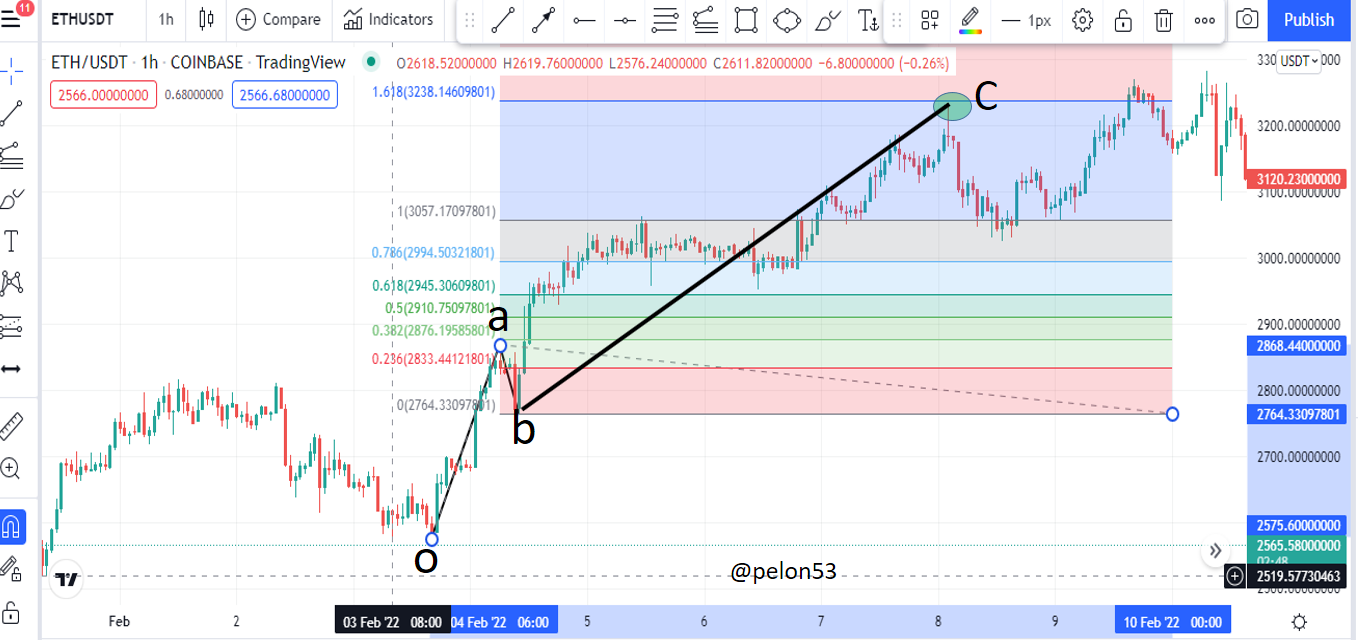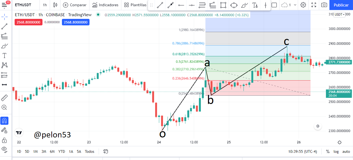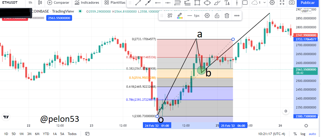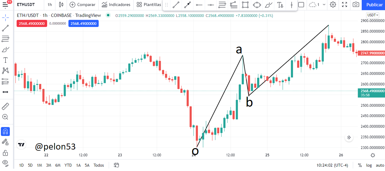 En el gráfico ETH/USDT, 1h, tomemos una tendencia alcista, como se muestra en la figura y marcamos el retroceso desde el inicio de la tendencia (o), hasta el final de la tendencia (a).