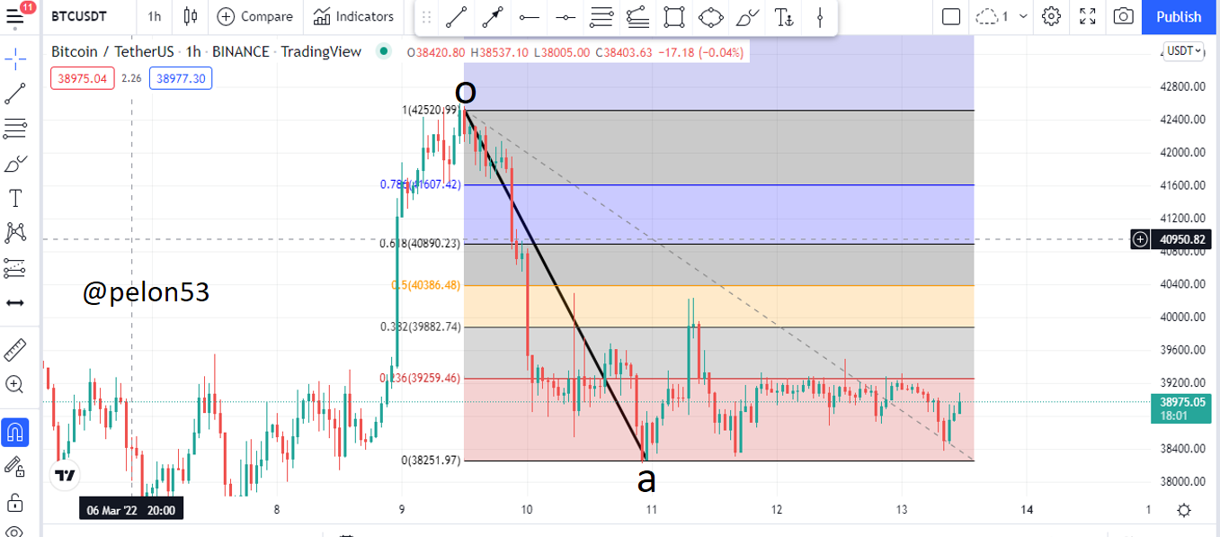 Ahora revisemos el gráfico BTC/USDT, 1h. Del día de ayer, donde tuvo una tendencia bajista. Marquemos el retroceso de Fibonacci, desde el punto (o), hasta el punto (a).