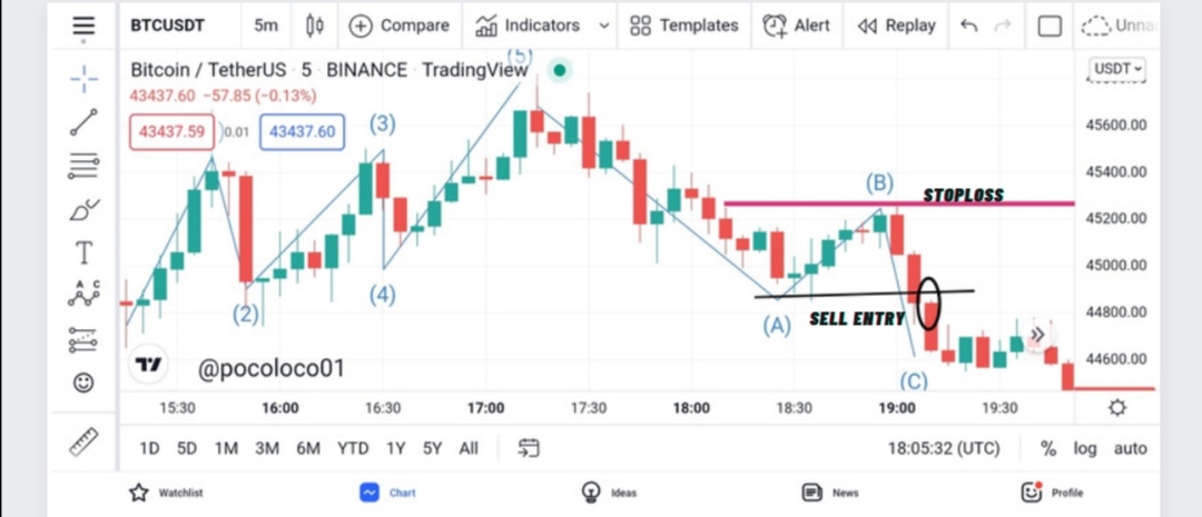 Here we identify the Eliot waves as usual then we observe the formation of A, B and C correction waves. Then we take a sell position just after the price breaks and close below the resistance at wave A.