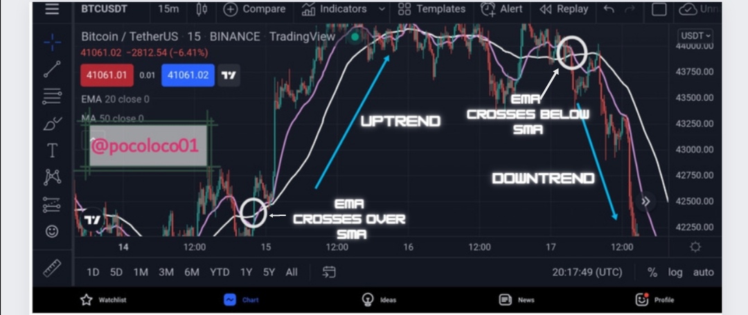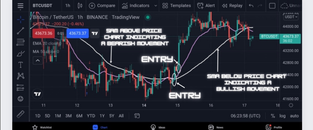 If the SMA is above the price chart, then it is a bearish movement and if it is below the price chart, then it is a bullish trend. After identification of the price chart using the SMA, I will look to observe the EMA by focusing on its action as regards the most recent price.