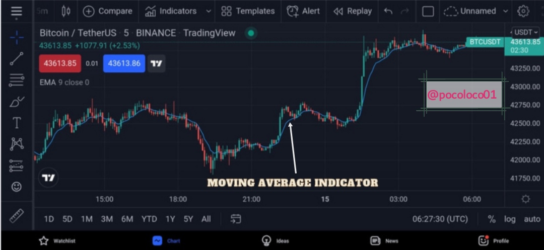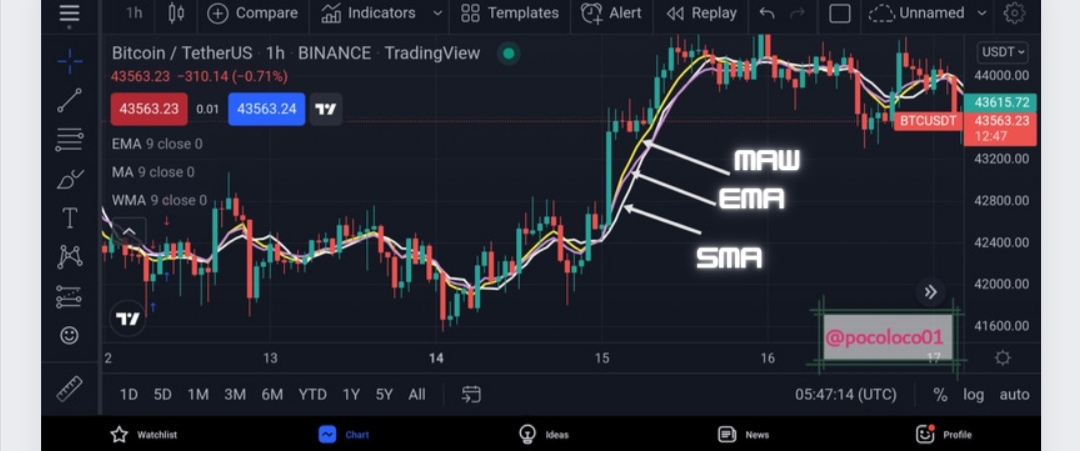 From the screenshot above, we will see the three moving average indicators applied on the BTC|USDT price chart. Observing closely, we will see that the white indicator which is the SMA is more away from the price while the EMA is closer but not as close as the MAW which is the closest to the price chart.