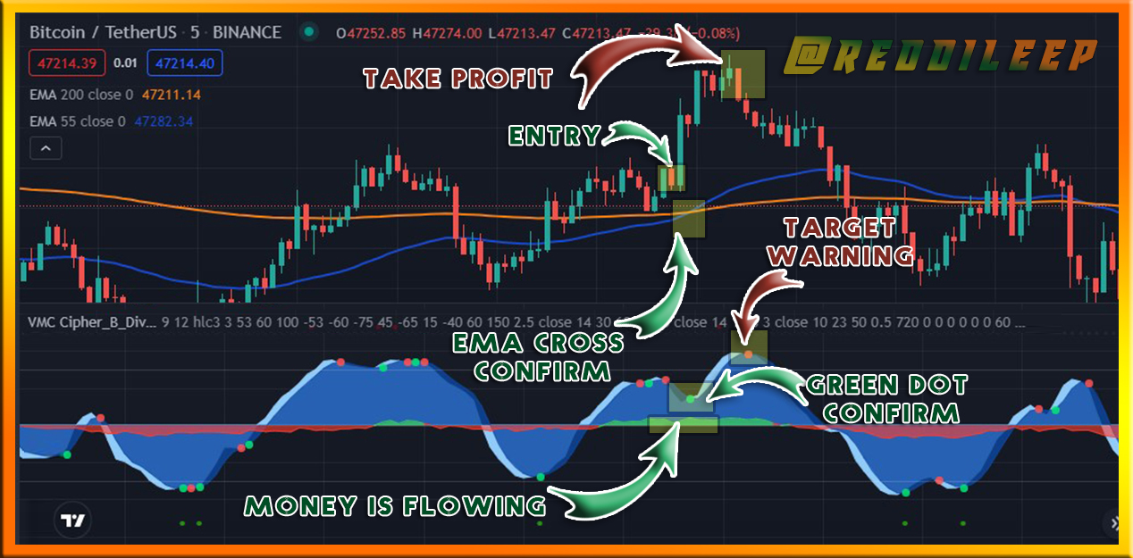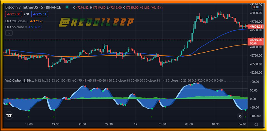 First of all, we should wait until 55 EMA cross above 200 EMA. Furthermore, we do not take the entry just because this crossing has taken place. Still, we have to wait until VuManChu Cipher B confirm the rest of the trading setup.