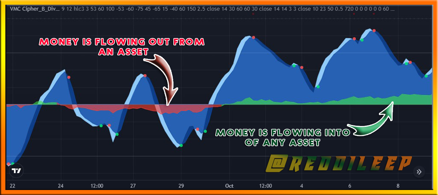 Then what looks like a cloud of Red and Green is called the Money Flow Index. So when that cloud is Green, it means that money is flowing into an asset. In the same way, when the cloud is Red, it means that money is flowing out of any asset. Check the below-attached screenshot to get an idea about it.