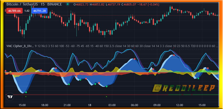 Basically, VuManChu Cipher B is a highly profitable colourful trading indicator that we can use for both bullish and bearish market predictions. In fact, this indicator is a combined indicator of main different indicators including RSI, Money Flow, Market Momentum and Market Volume. We all know we have some limitations when we use some trading platforms without purchasing their premium packages. In such cases, we are unable to add more than 3 indicators to our charts. So, here we can use this indicator for analyzing our charts beyond current limitations.