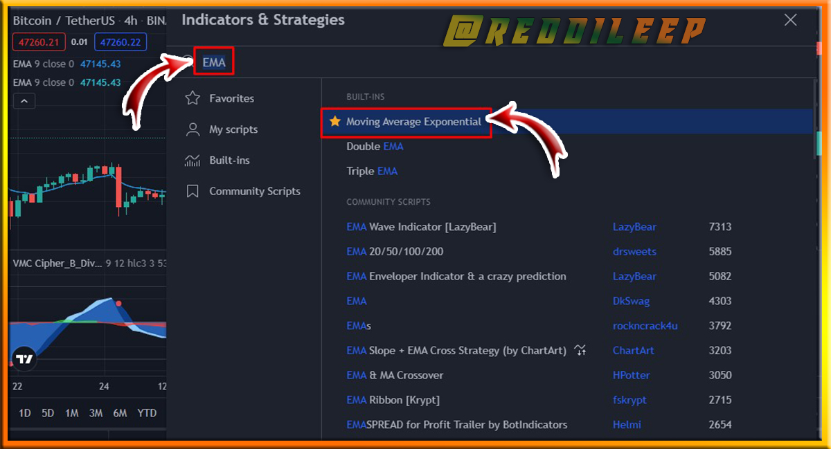 Here I need to click on "Indicators & Strategies" again and search for "EMA". Especially, I have to click on "EMA" two times for adding two EMAs to my chart.