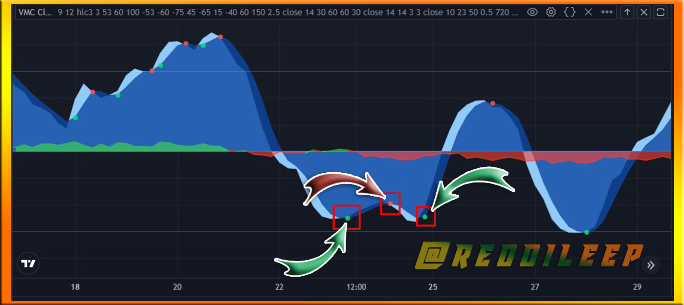 This is the basic method for a long entry. In the same way, we can get a sell short entry using its reverse method. Here I will not repeat it as I have already discussed too many facts regarding VuManChu Cipher B.