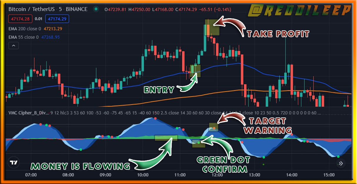 Finally, we should get confirmation from the Wave Trend Indicator through our VuManChu Cipher B indicator. For that, we should wait until Wave Trends crosses each other. We can clearly identify that exact cross with a Green Dot. After the formation of this Green Dot, we can take our buy long entry. I will clearly demonstrate this in a chart.
