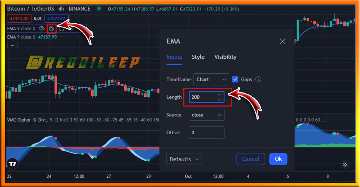 Now I have two EMAs in my trading chart. So, I have to customize them according to the required time periods. (200 Period Moving Average and 55 Period Moving Average). Below I have simply explored it in a screenshot. However, I will not explain these things deeply as we have learned them many times in our previous lessons.