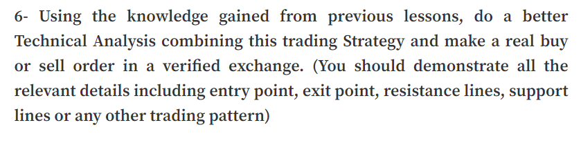 6- Using the knowledge gained from previous lessons, do a better Technical Analysis combining this trading Strategy and make a real buy or sell order in a verified exchange. (You should demonstrate all the relevant details including entry point, exit point, resistance lines, support lines or any other trading pattern)