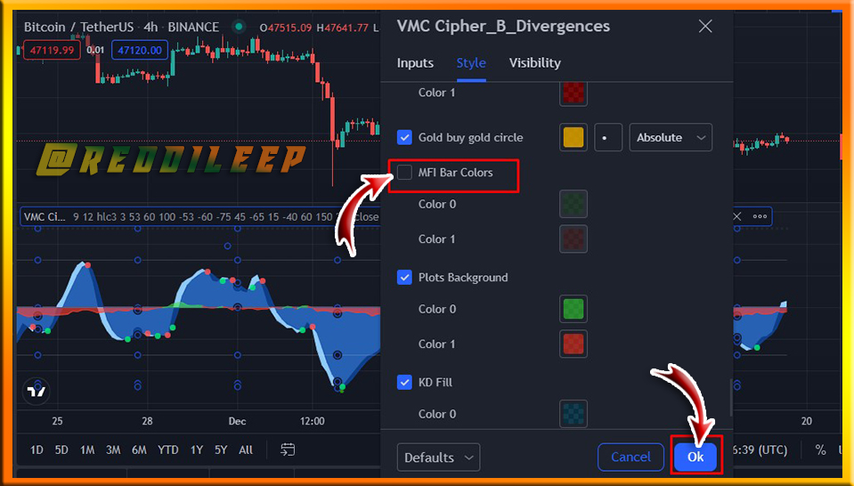 Finally, we need to remove the "MFI Bar Colors" indicator. This is a Money Flow Index Colors bar which represents a different colours bar at the bottom. Then, click on the "OK" icon.