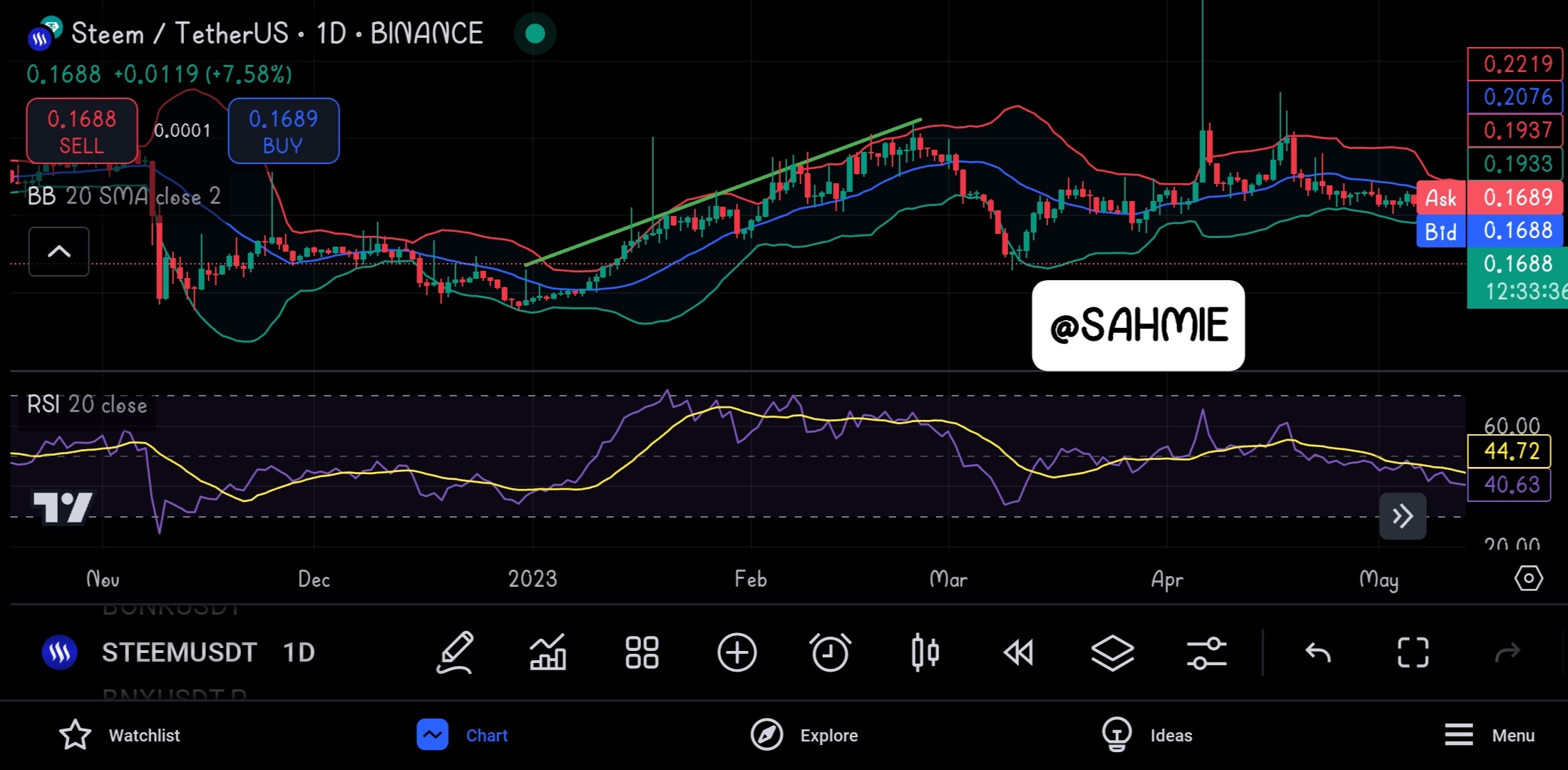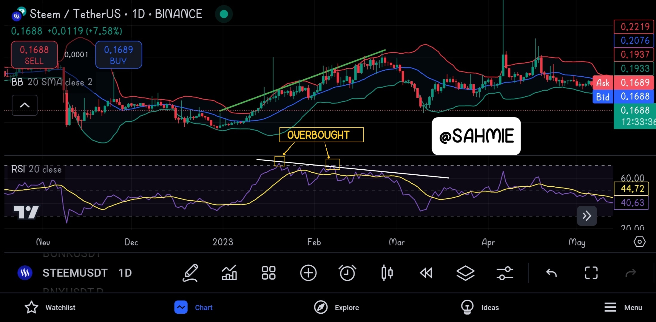 These bands help identify volatility and potential price reversals. When the price touches the lower Bollinger Band and you see a bullish divergence, it indicates that the price might bounce back up. For instance, if the Steem token hits the lower band and shows a bullish divergence, traders might expect a price increase soon. Conversely, if the price is at the upper band with a bearish divergence, it suggests that the price might soon drop.