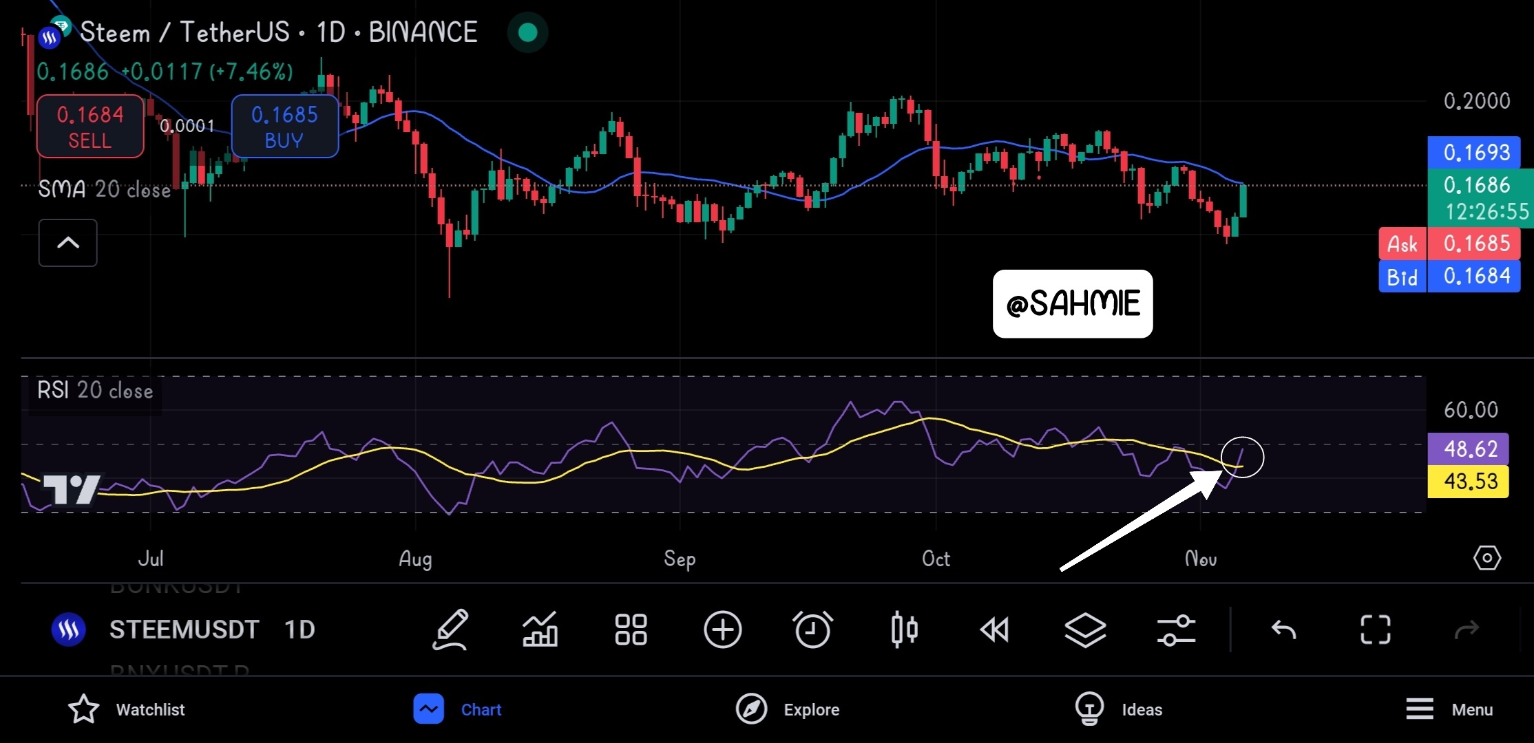Looking at the above chart, which is STEEM/USDT at a 1-day time frame seems like the price of STEEM is above moving upwards as the price is crossing above the RSI moving average, however looking at the a shorter timeframe we can get different market movements just like the one below;