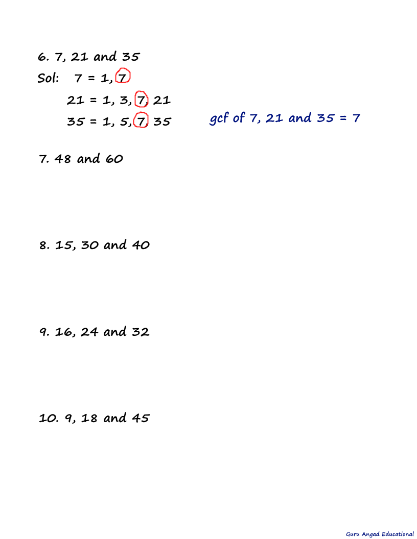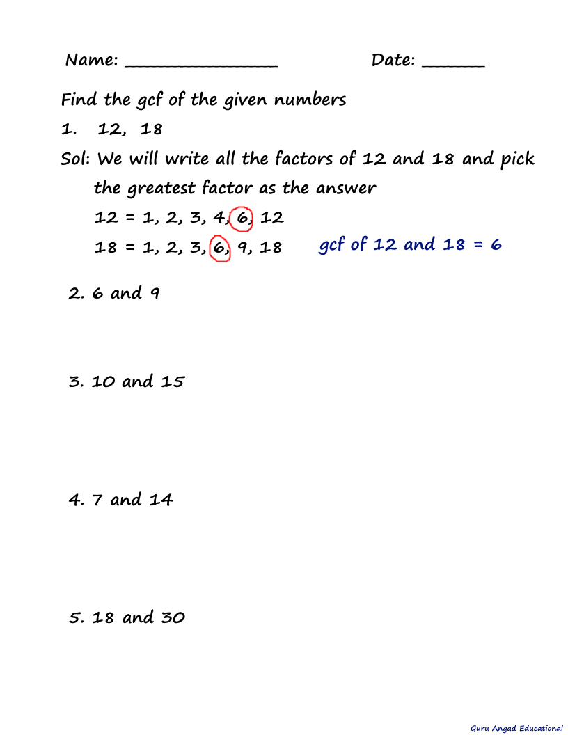 Following are the worksheets to practice how to find gcf. Couple of the problems solved for explanation;