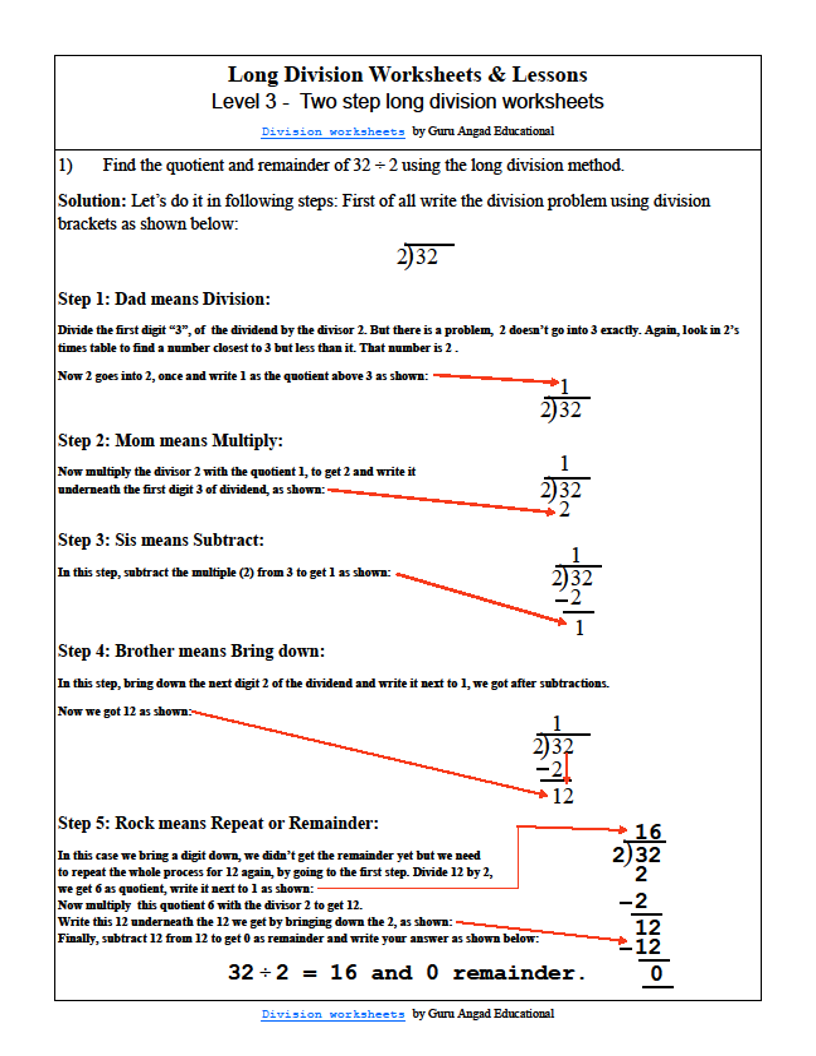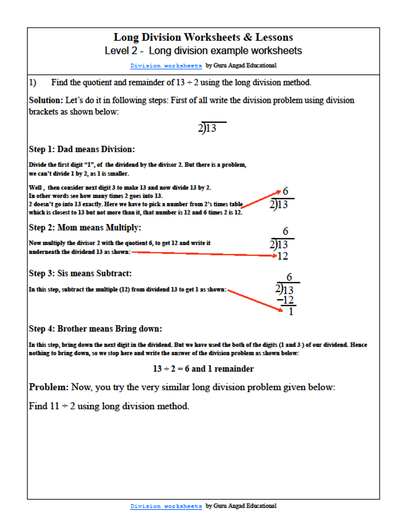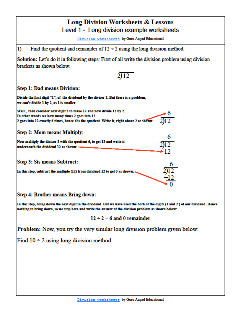 Below are the solutions to some very very basic long division problems using the above words to learn the basic long division algorithm.