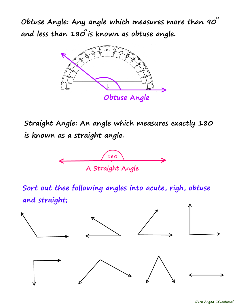 Below are the worksheets explaining each type of the angles followed by a small exercise to test the knowledge of 4th graders about types of angles;