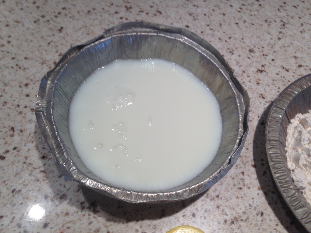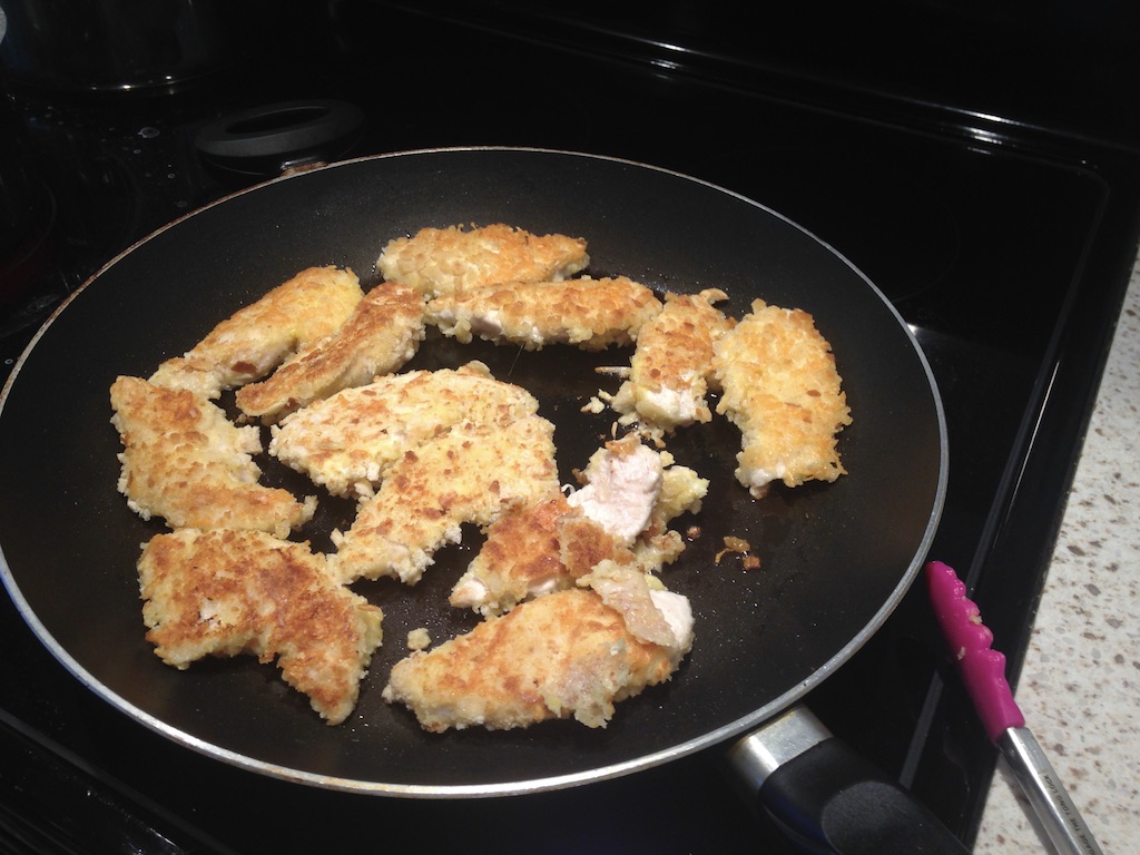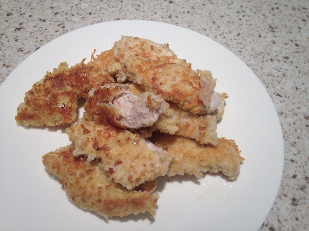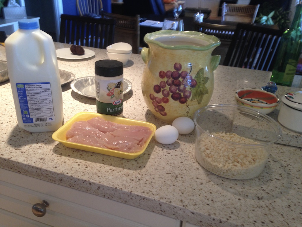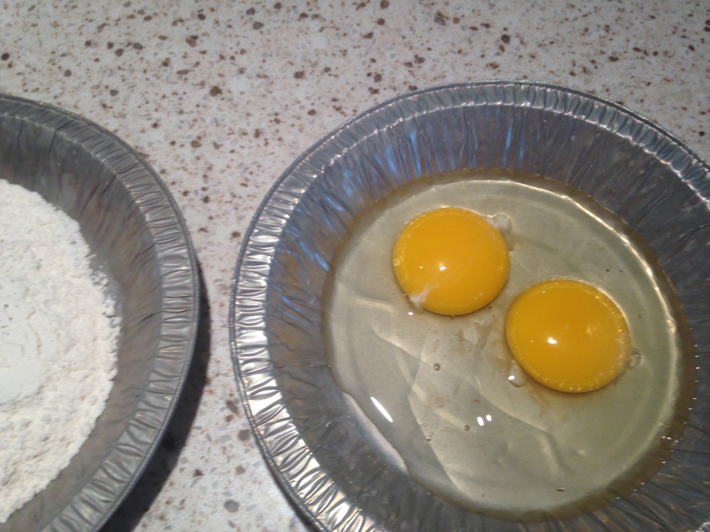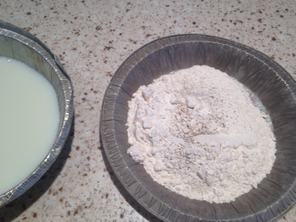 For the tenders I usually allow 3 per portion. Take the tenders and dip them in the milk. Move them to the flour and dredge them thoroughly with flour. Next dip them in eggs that have been lightly beaten. Finally move to breadcrumbs and thoroughly cover with the crumbs.