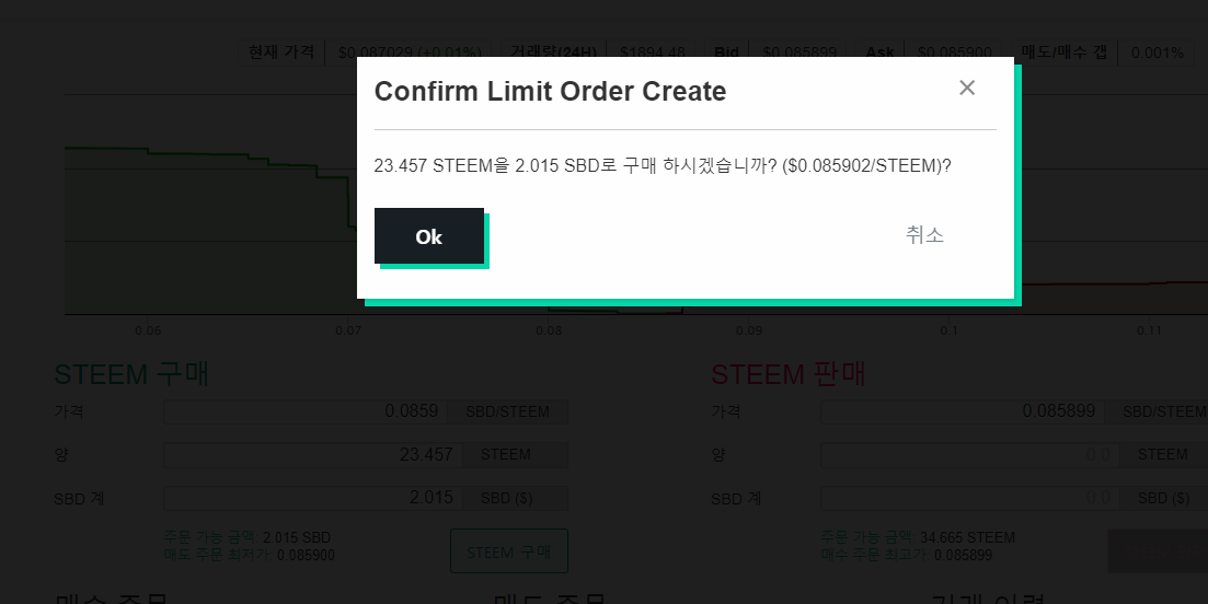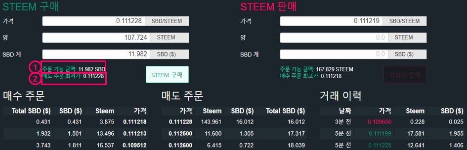 그럼 두번째 화면처럼 스팀 달러(SBD)를 통해서 스팀(STEEM)을 사고,