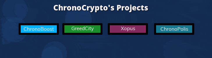 Current Chronocrypto Projectschronocrypto (73)in #steempress • 8 years ago (edited) #xopus #chronoboost #greedcity