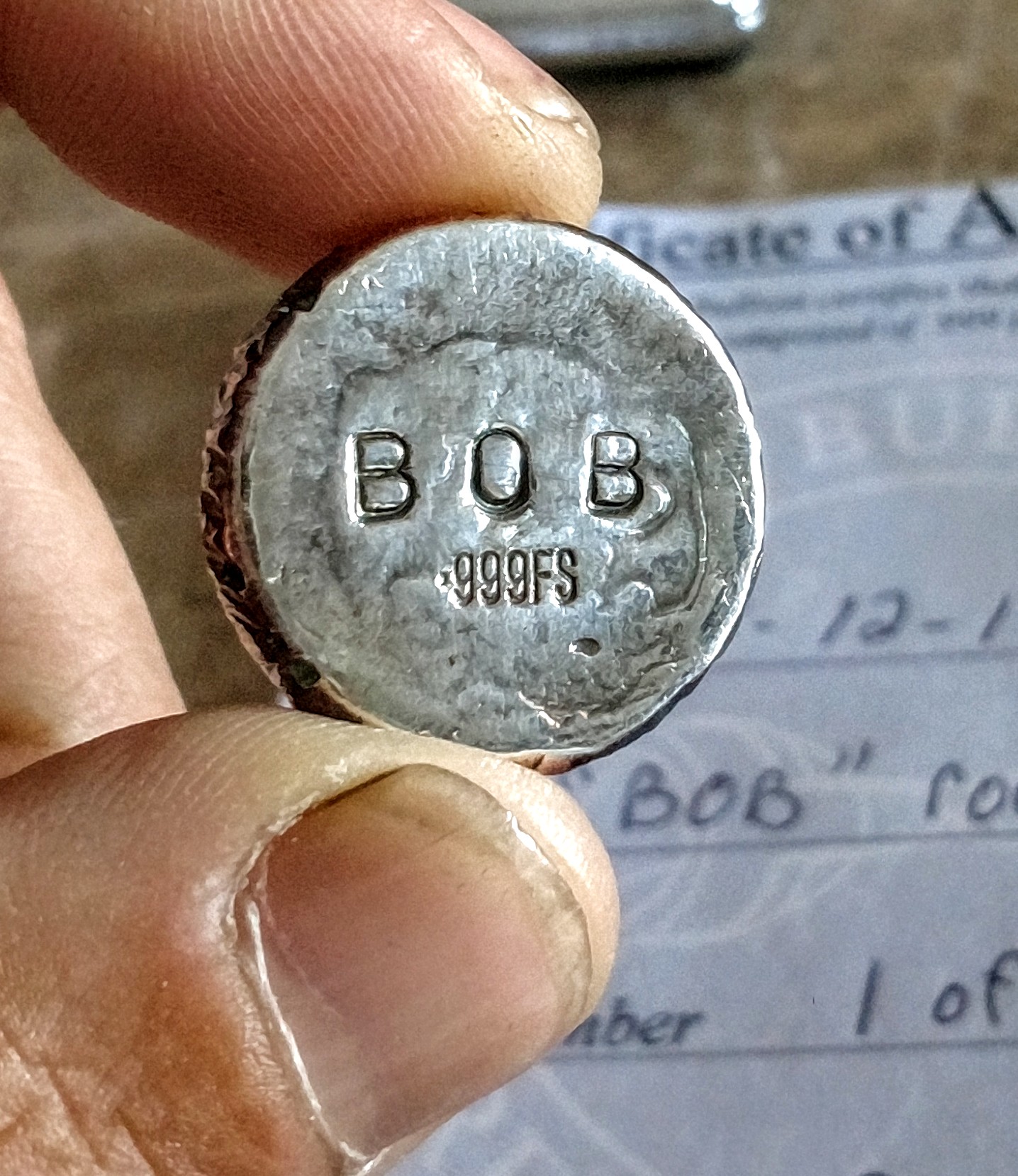 The reverse is stamped with his name, Bob and .999fs.