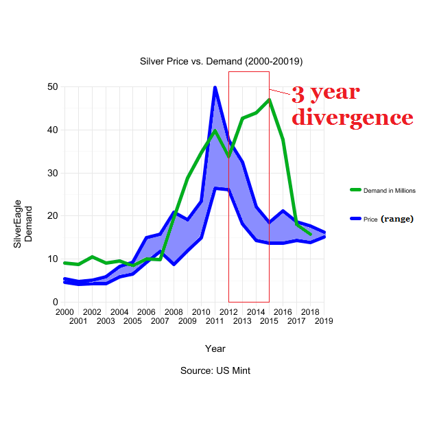 The divergence is a large unexplained gap between silver bullion demand and its price, beginning January 2013 and ending June 2016.