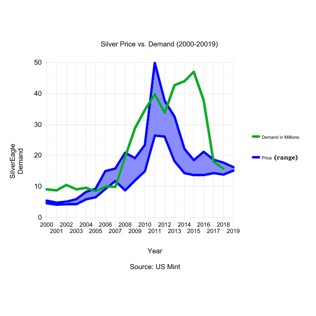 The US Mint produces the most well-known (and minted) silver bullion item in the world - the US Silver Eagle. When looking at physical demand for silver bullion, for simplicity I look primarily at the Silver Eagle sales data, available on their website. (A closer look at sales data for the Canadian Silver Maple - published quarterly - and many other coins minted around the world, gives similar results.)