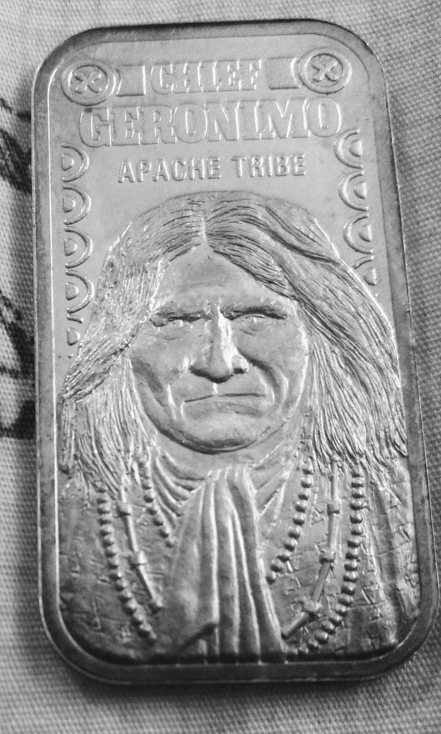 Continuing this series of bars featuring Native American chiefs, we now come to Geronimo. He wasn't actually a chief (despite what the bar says), but did lead various bands of Apaches at various points throughout his life. He spent a large portion of his life in conflict, both with Mexican and American soldiers. It all started when a group of Mexican soldiers slaughtered his camp, including his family, while he was trading in town. He carried a vendetta against Mexicans for the rest of his life and often attacked groups of Mexicans on sight.