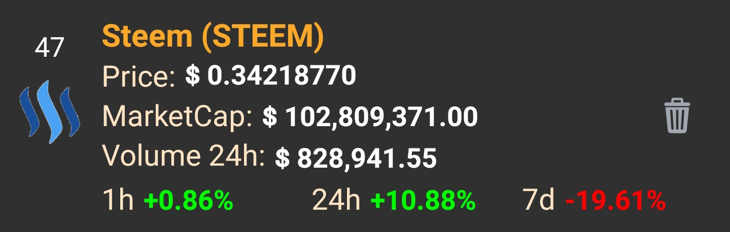 Steem has seen a little better recovery than bitcoin has in the past 24 hours. Currently sitting at 10.88% increase in the past 24 hours. Maybe just maybe the pain is over with and we will see a nice recovery.