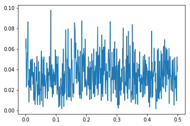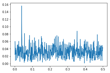 Now we have a bit of a problem that we haven't been addressing that you might have spotted. If we look again at our frequency spectrum, we see a lot of peeks that are just noice. Only one of them isn't, that is, only one of then isn't just noice. As this one is the one we will be looking at in detail next, the noice part of the peek we are interested in might very well show us stuff that isn't really there. We could pull out the math and the statistics here, but lets not do this now as to keep this hands on. Just look at our frequency spectrum and pick the five highest peeks, appart from the one we created ourselves, We could draw a line at about 0.75 and capture all but these five outliers. The chances of such an outlier hitting exactly our frequency are slim but not zero. If it ended up hitting us, we would want its impact to not make our findings complete nonsense.