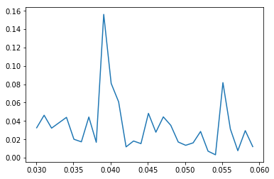plt.plot(xf[30:60], absyf[30:60])