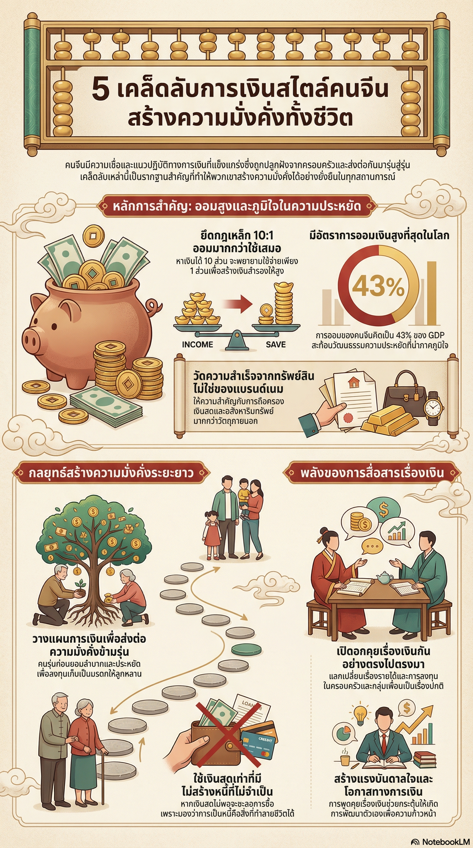 5 เคล็ดลับการสร้างความมั่งคั่ง ตามแบบฉบับครอบครัวชาวจีนที่เน้นการปลูกฝังวินัยทางการเงินอย่างยั่งยืน โดยให้ความสำคัญกับการ ออมเงินในสัดส่วนที่สูง และการใช้ชีวิตแบบ ประหยัดมัธยัสถ์ เพื่อสะสมทรัพย์สินมากกว่าการอวดรวยด้วยวัตถุภายนอก นอกจากนี้ยังเน้นย้ำถึงการ วางแผนส่งต่อมรดก ข้ามรุ่นผ่านอสังหาริมทรัพย์ รวมถึงการรักษาสภาพคล่องด้วยการ เลี่ยงการสร้างหนี้ สินที่เกินตัว ประการสุดท้ายคือการสร้างค่านิยมให้คนในสังคม เปิดอกพูดคุยเรื่องการเงิน และการลงทุนอย่างตรงไปตรงมาเพื่อกระตุ้นให้เกิดการพัฒนาฐานะและสร้างโอกาสในการต่อยอดรายได้ในอนาคตครับ