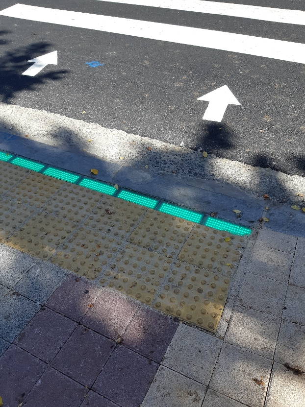발 밑에 녹색과 붉은색의 조명을 신호 체계에 맞게 바뀜으로 보행자가 더 안심할 수 있겠습니다.