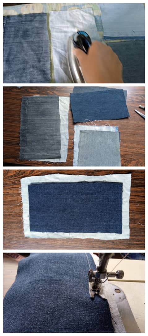 Primero plancha todos los retazos con los que piensas trabajar. Luego tomas uno de los recuerdos más grande y colocas sobre éste los otros dos, y lo fijas. Reservas para trabajar con ellos más adelante.