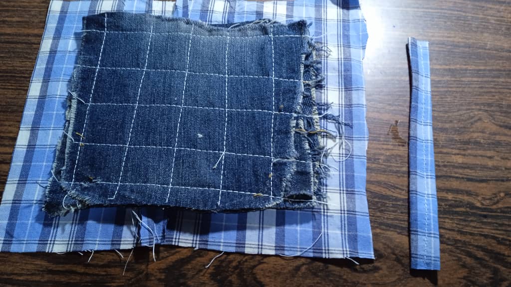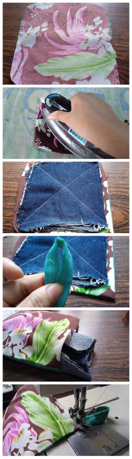 Para la segunda opción: recorta un cuadro de 18 x 18 cm (7in.) esta puede ser de algodón estampado ( no uses sintético). Y otro recuerdo de 16 x 16 cm (6,2 x 6,2in.). Este servirá de relleno. Una vez que cosas y voltees la bolsita estampada, rellena con el jeans, cierra y coloca un colgadero.
