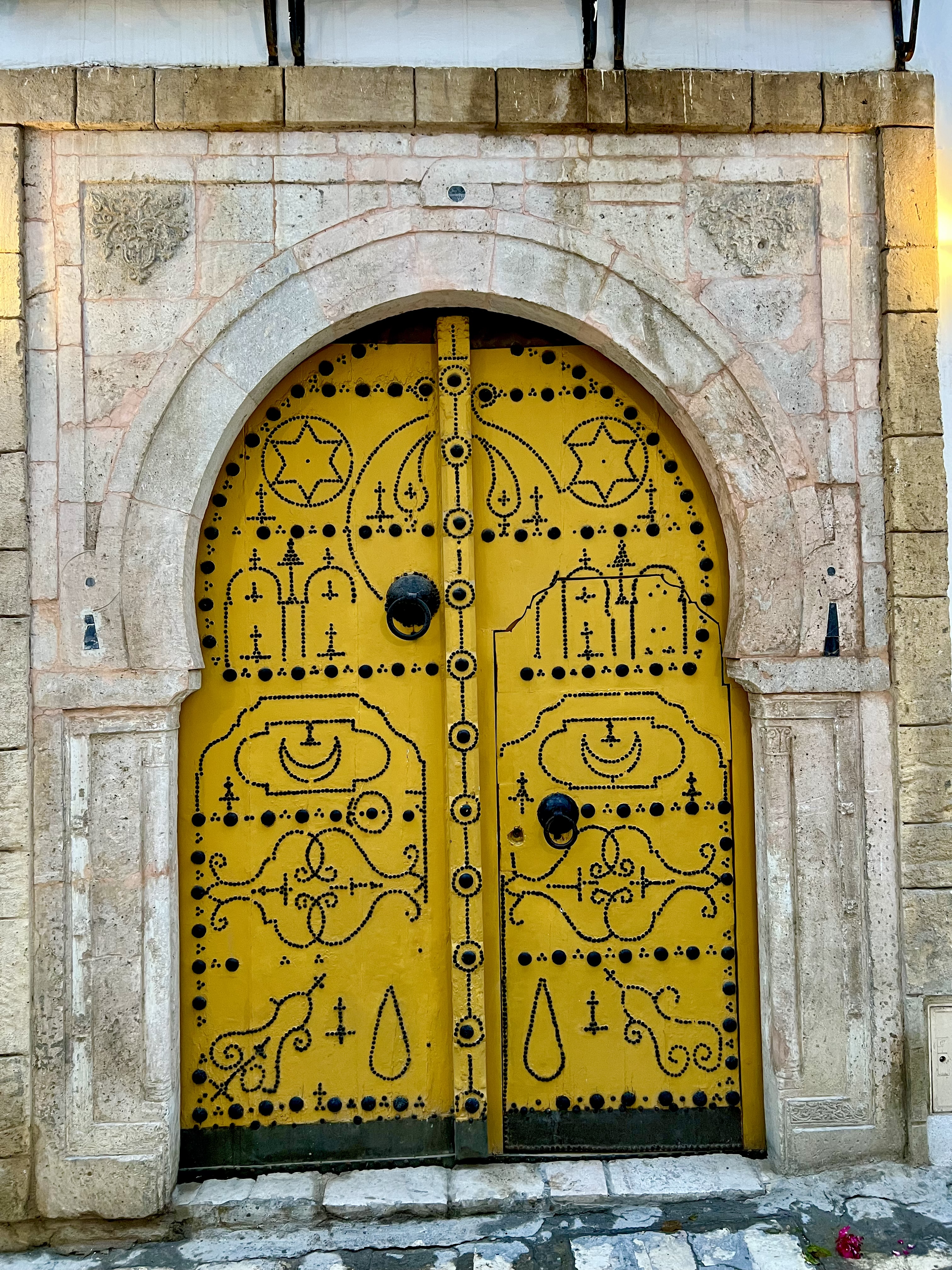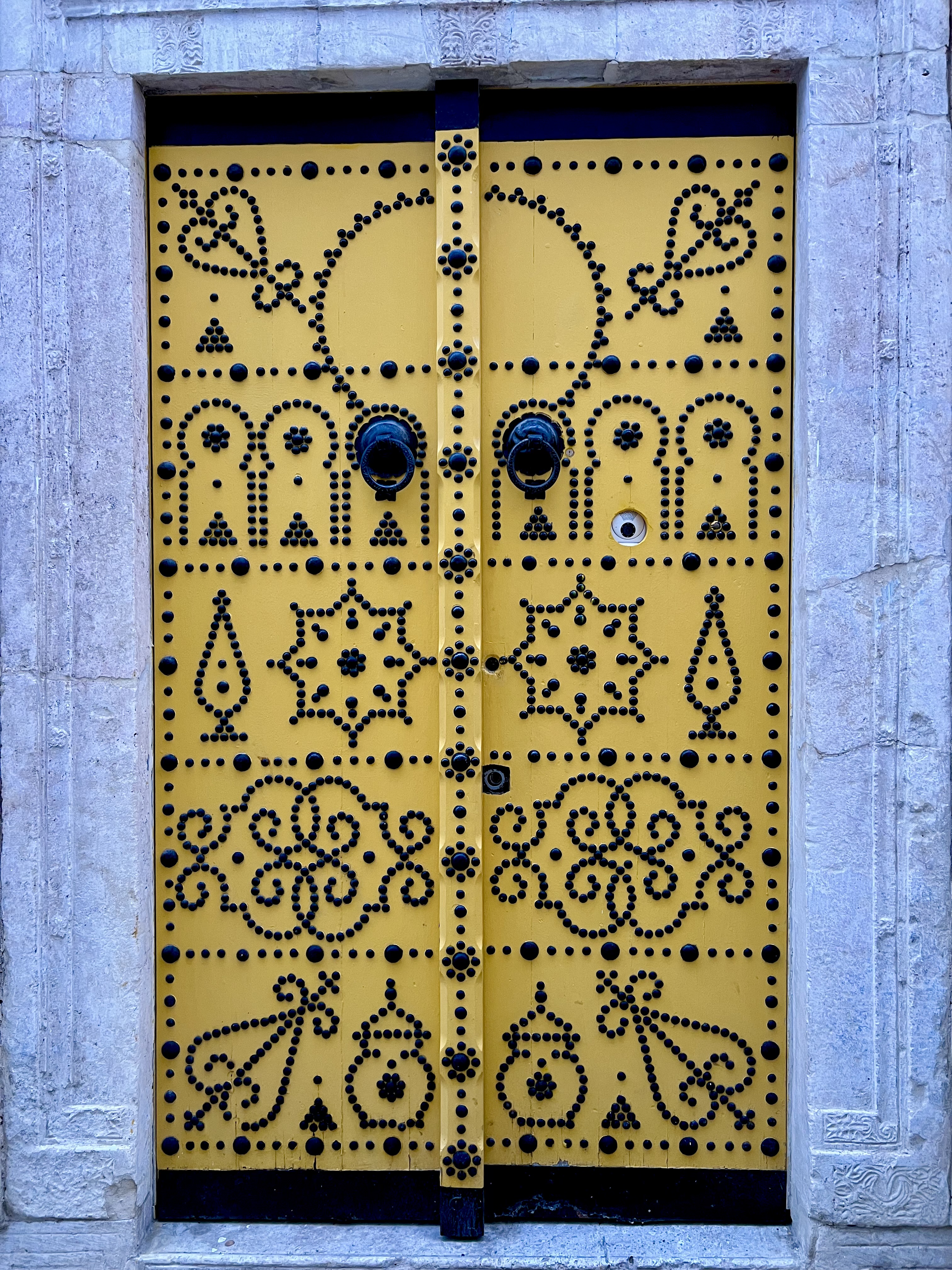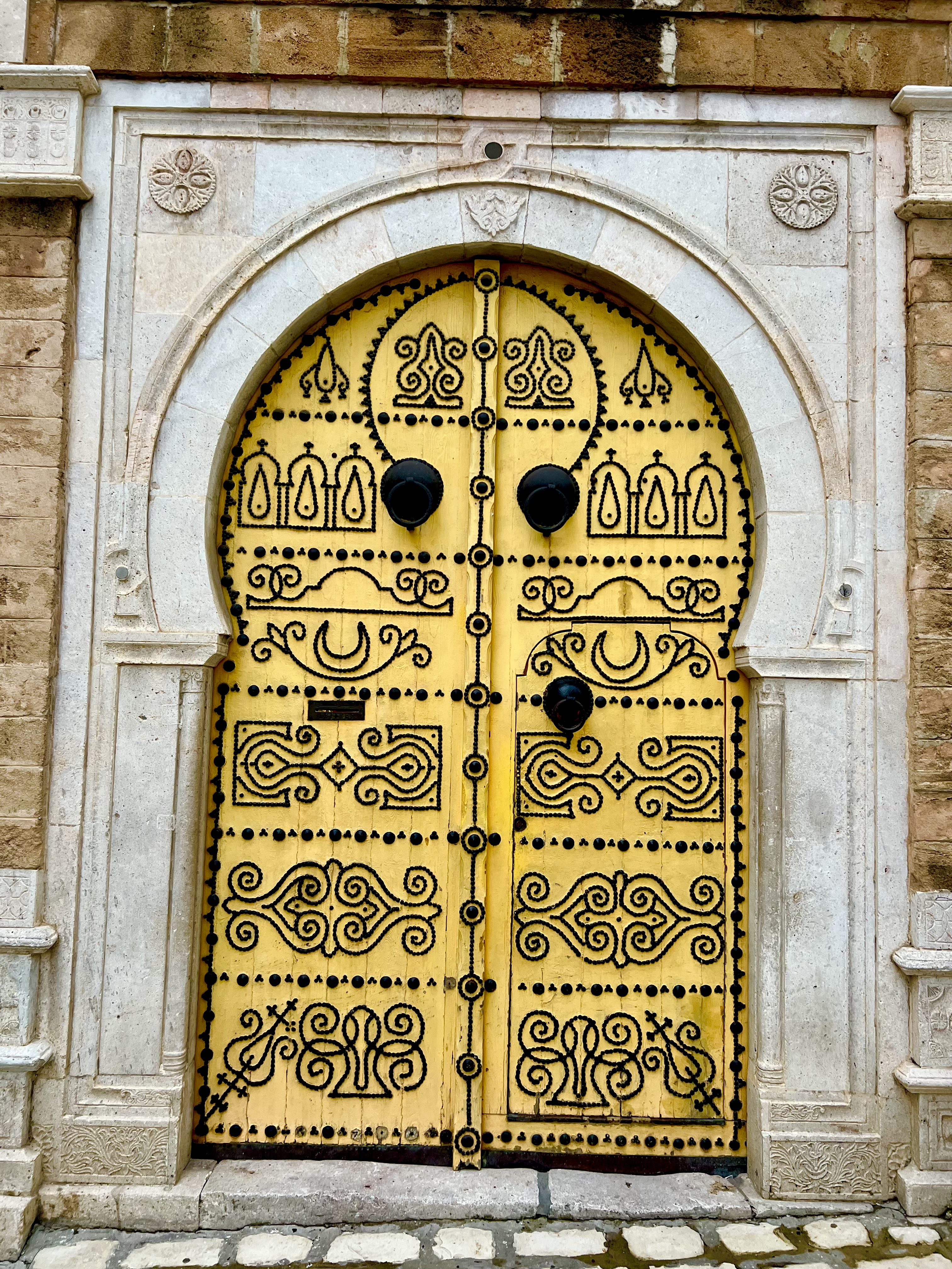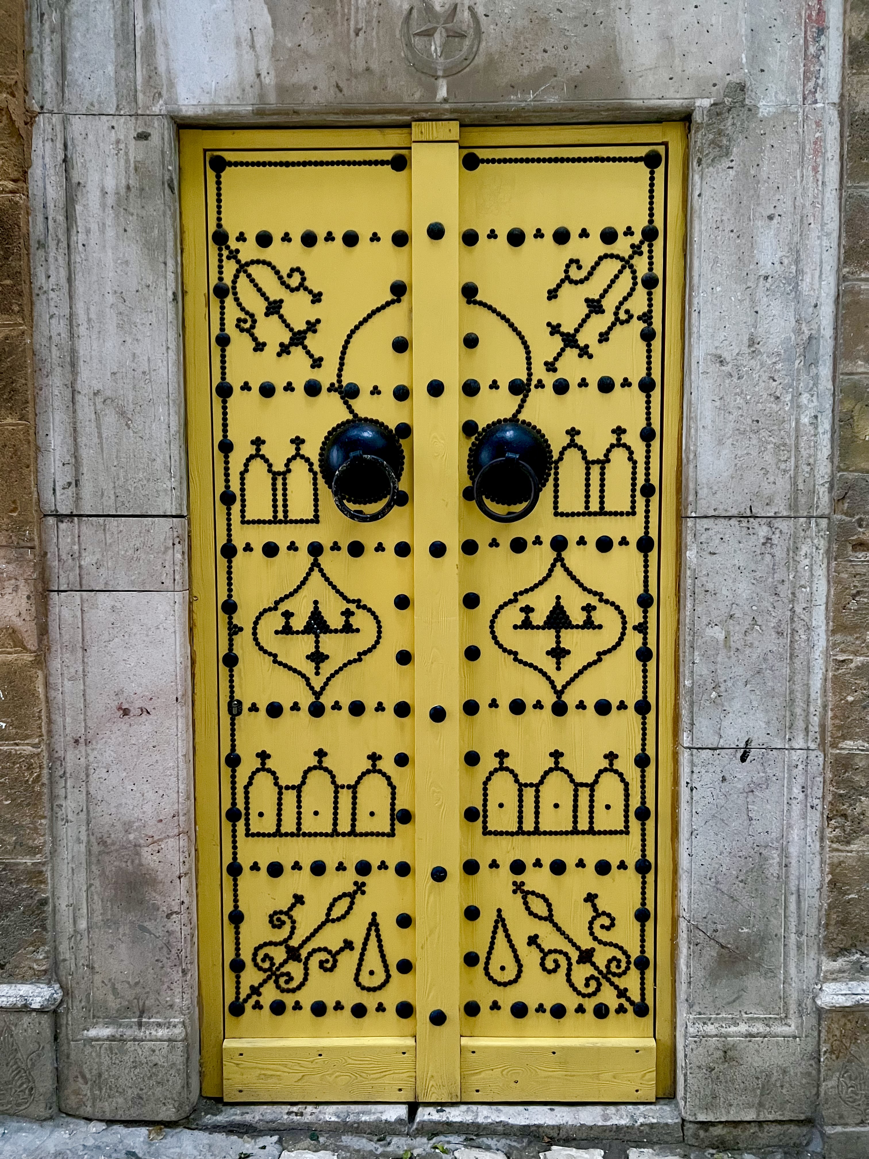 A traditional yellow wooden door with black metal studs in the old Medina of Tunis.