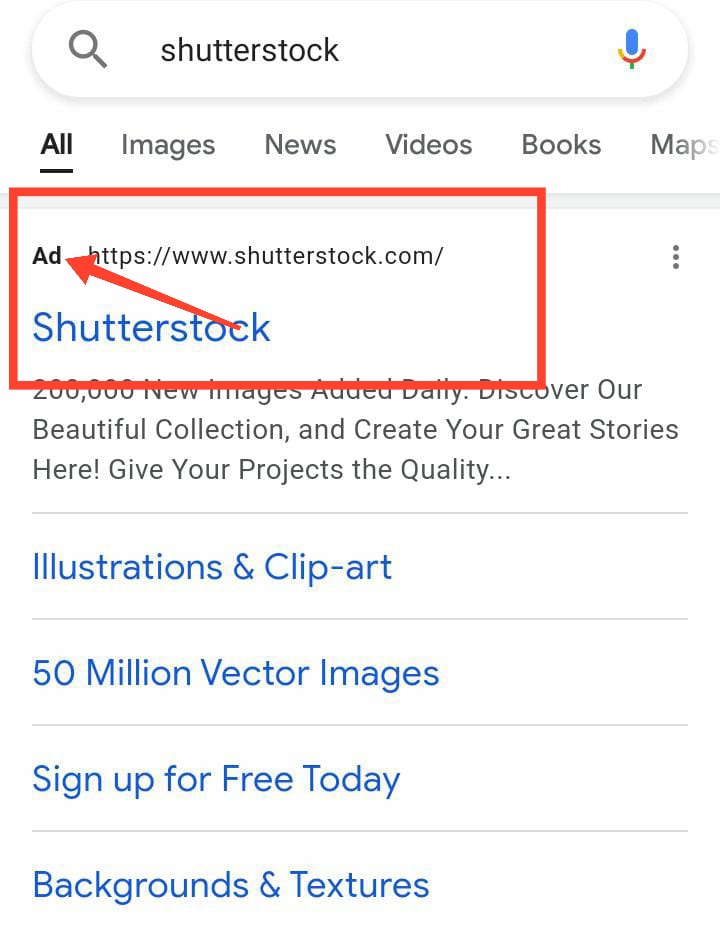 - Be careful that you have to click on the real site not on the ads. Because these are for promotional sites not for free images as I have shown in the image below. Then click on the shutter stock and the shutter stock site will open.