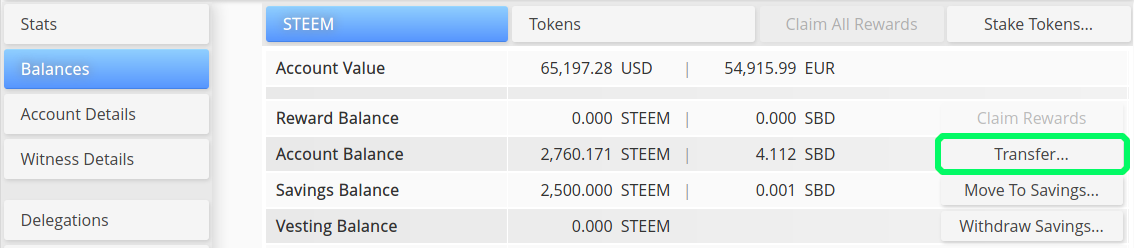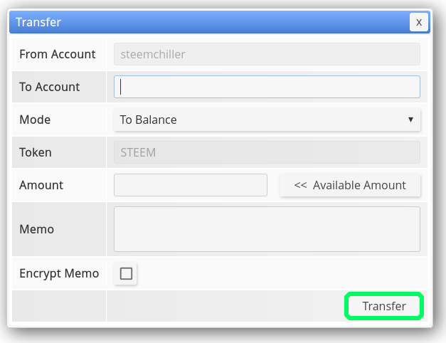 Then the transfer form will show up. Just enter the target account, amount, memo and click on 'Transfer':