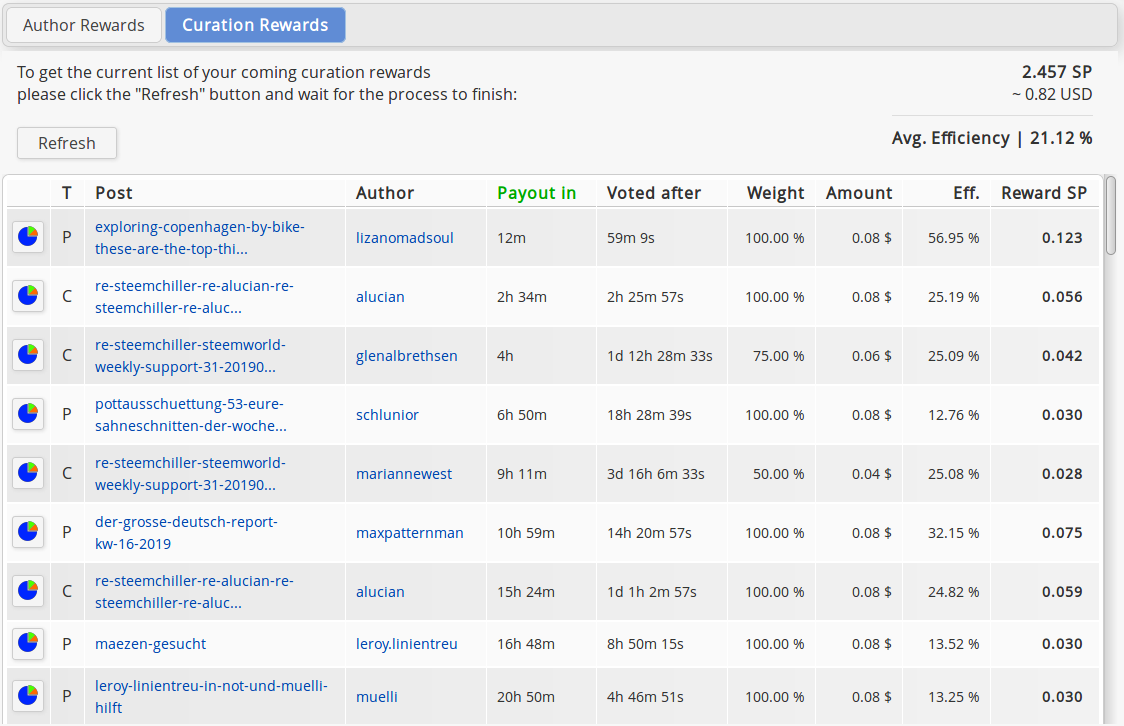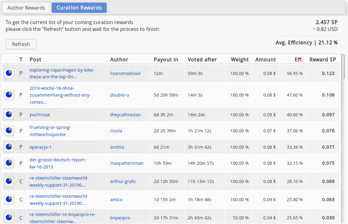 We now have a few more details about our voting results in the overview. The column 'Eff.' shows us the efficiency of each vote. Being an early voter (before a strong whale vote comes in) leads to better results (higher SP rewards) in most cases.