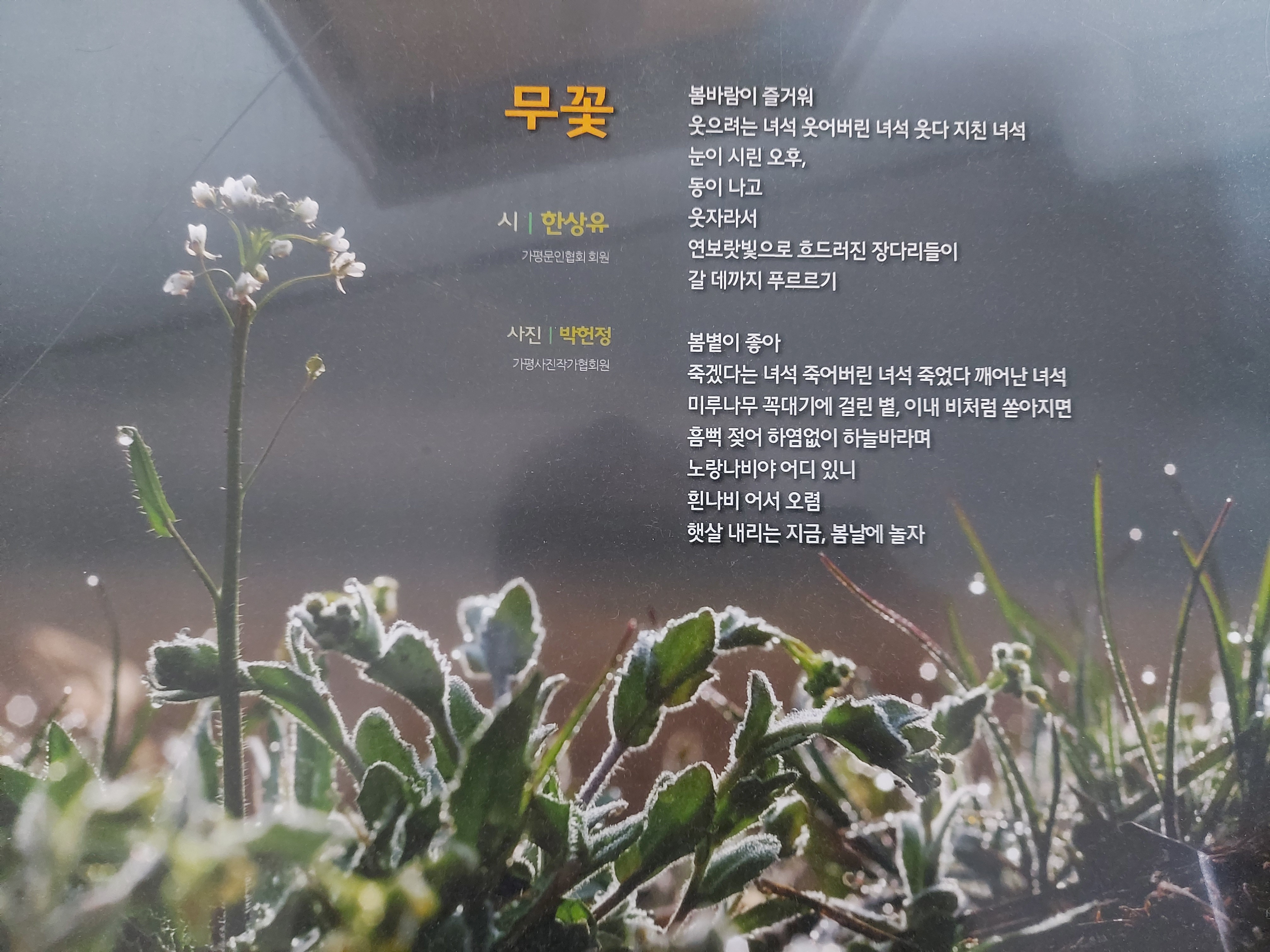 무꽃hansangyou (77)in #steemzzang • 10 days ago <무꽃> ---한 상 유--- 봄바람이 즐거워 웃으려는 녀석 웃어버린 녀석 웃다 지친 녀석 눈이 시린 오후, 동이 나고 웃자라서 연보랏빛으로 흐드러진 장다리들 갈 데까지 푸르르기 봄볕이 좋아 죽겠다는 녀석 죽어버린 녀석 죽었다 깨어난 녀석 미루나무 꼭대기에 걸린 볕, 이내 비처럼 쏟아지면 흠뻑 젖어 하염없이 하늘바라며 노랑나비야 어디 있니 흰나비 어서 오렴 햇살 내리는 지금, 봄날에 놀자 #zzan #kr #krsuccess #life #writing #poem #steemit