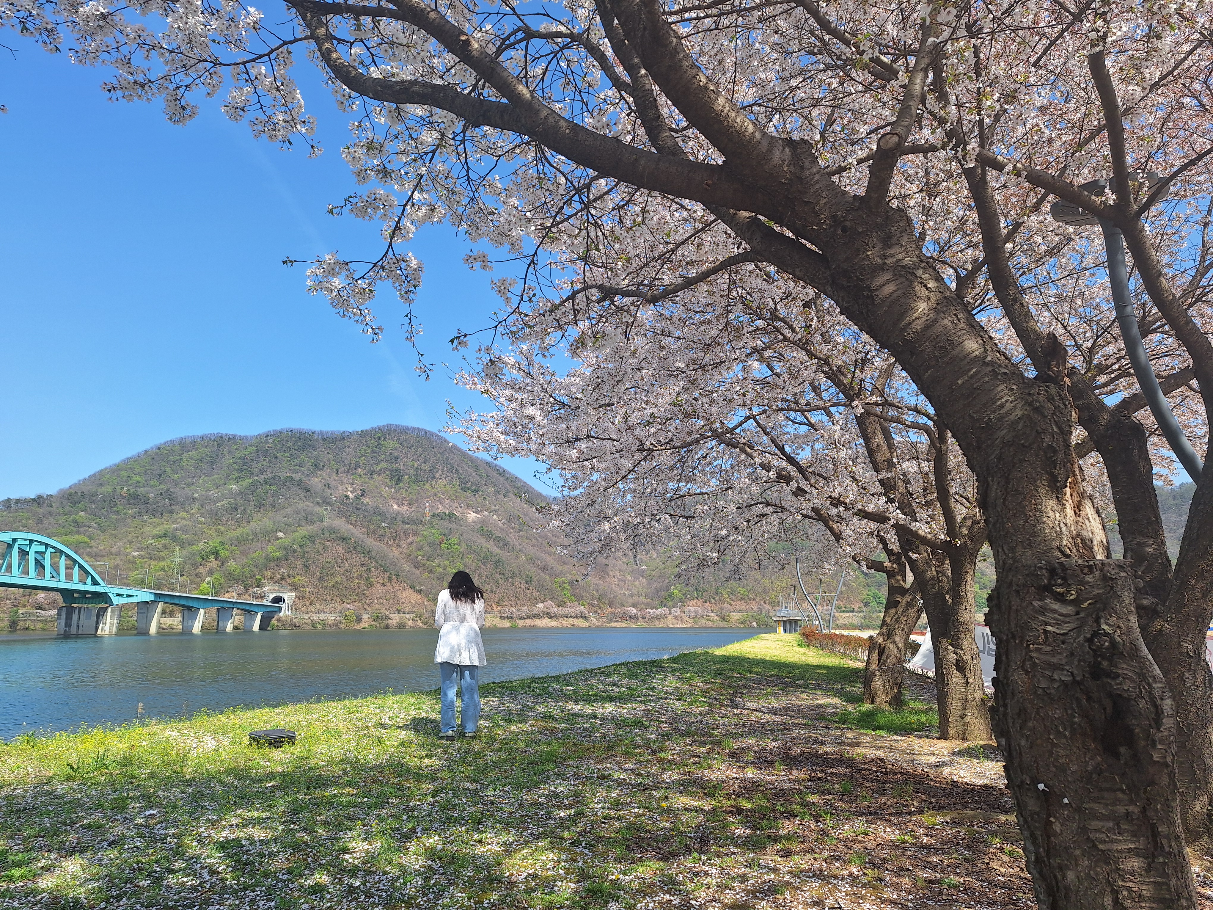 철교, 터널,강물, 벚나무, 벚꽃, 여인, 뒷모습, 청바지 , 산, 연초록으로 스며드는 봄바람.