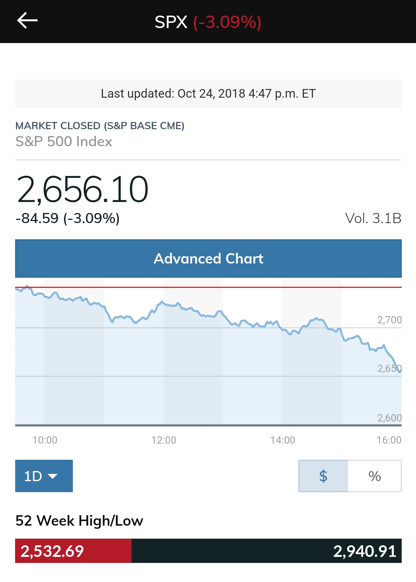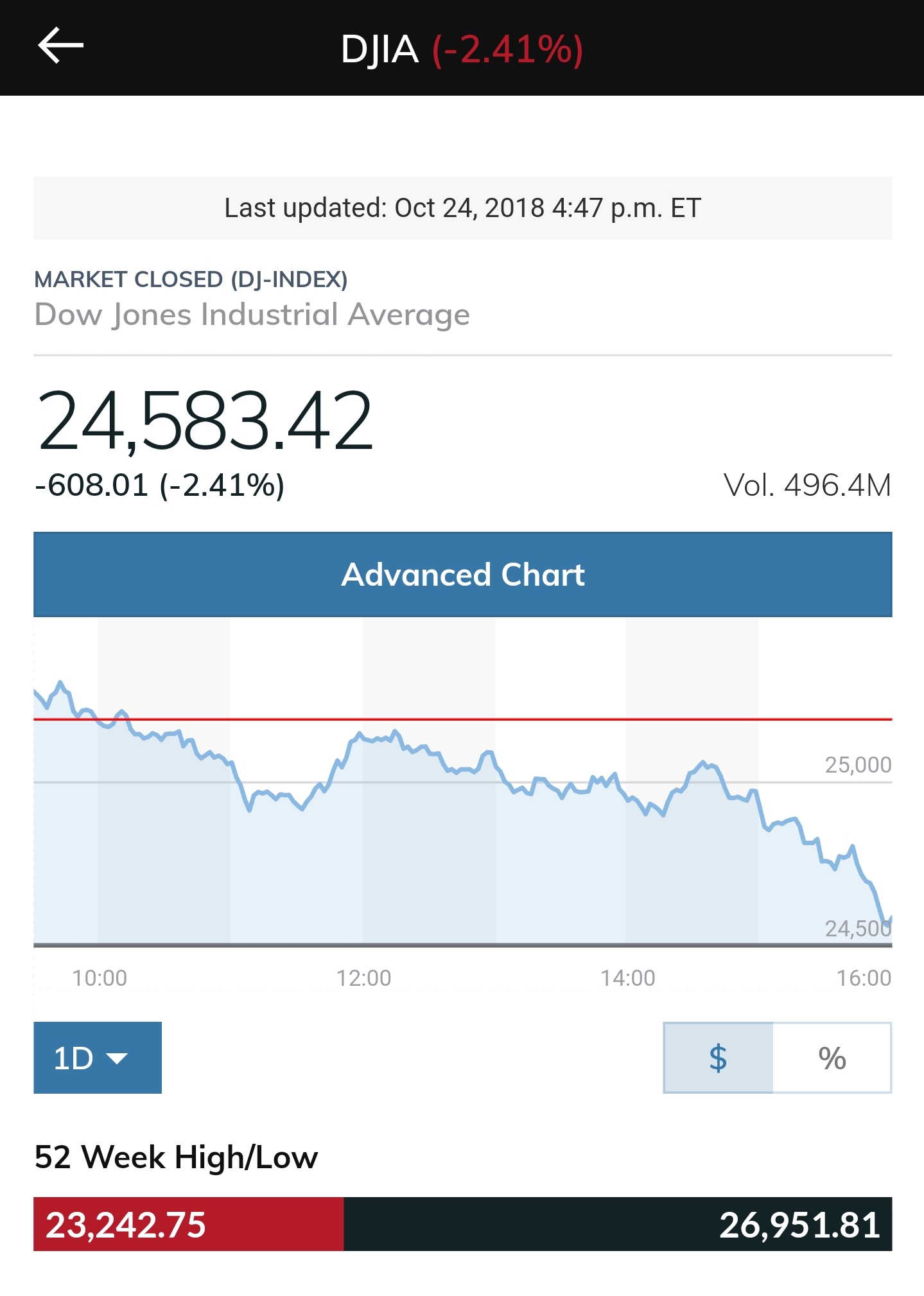 Dow Jones closed below 25,000 today. 25,000 was a threshold that could spell trouble for the coming days. With the 52 week low being at 23,250 we could be witnessing the correction everyone new was coming but didn't want it to come.
