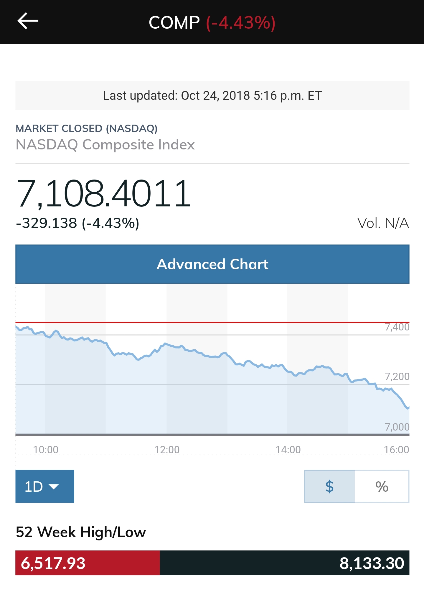 NASDAQ was the big loser today closing at over 4.4 % down and getting closer to the 52 week low and far away from the 52 week high.