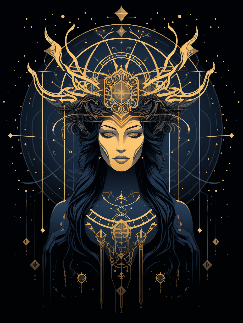 The woman in the deer crown gazed into the stars, her compass guiding her way. She was a wanderer, a seeker of knowledge and truth. She had traveled far and wide, exploring the world both physical and spiritual.
