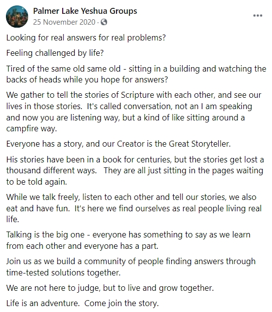 Here's how a Yeshua group in the Denver/Colorado Springs area describes themselves. If this is something you want in your life we're here to help you get it. Learn more: https://yeshuagroups.com/start