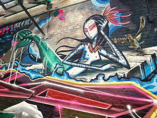 This wall i created a couple of years ago with french artist Kaldea. We did the wall without planning it so much in the first way. Sometimes i love to just go some where, meet people collaborate and create. It has not to be fully planed out all the time. In streetart or Graffiti you can either team up and totally plan a wall, make sketches first and set up colours- or you just let it flow without planning and you let this painting grow on the wall by itself. I like both ways. I think sometimes it is better to plan things a little but it could be also very hard to collaborate and plan things with others. I mean we are all artists with our own creativity, our own ideas, views of things and how they should look like.